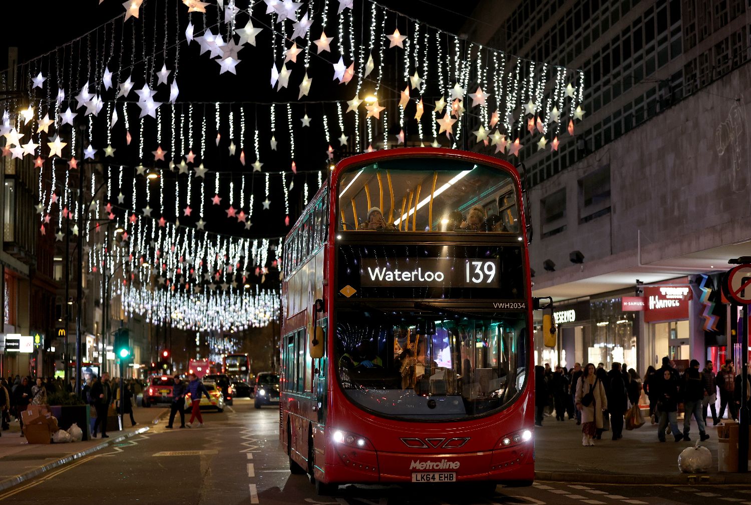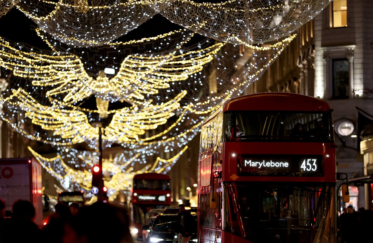 12月17日,在英国伦敦,一辆双层巴士驶过悬挂彩灯的街道。(图片来源:本文图片均据新华社)