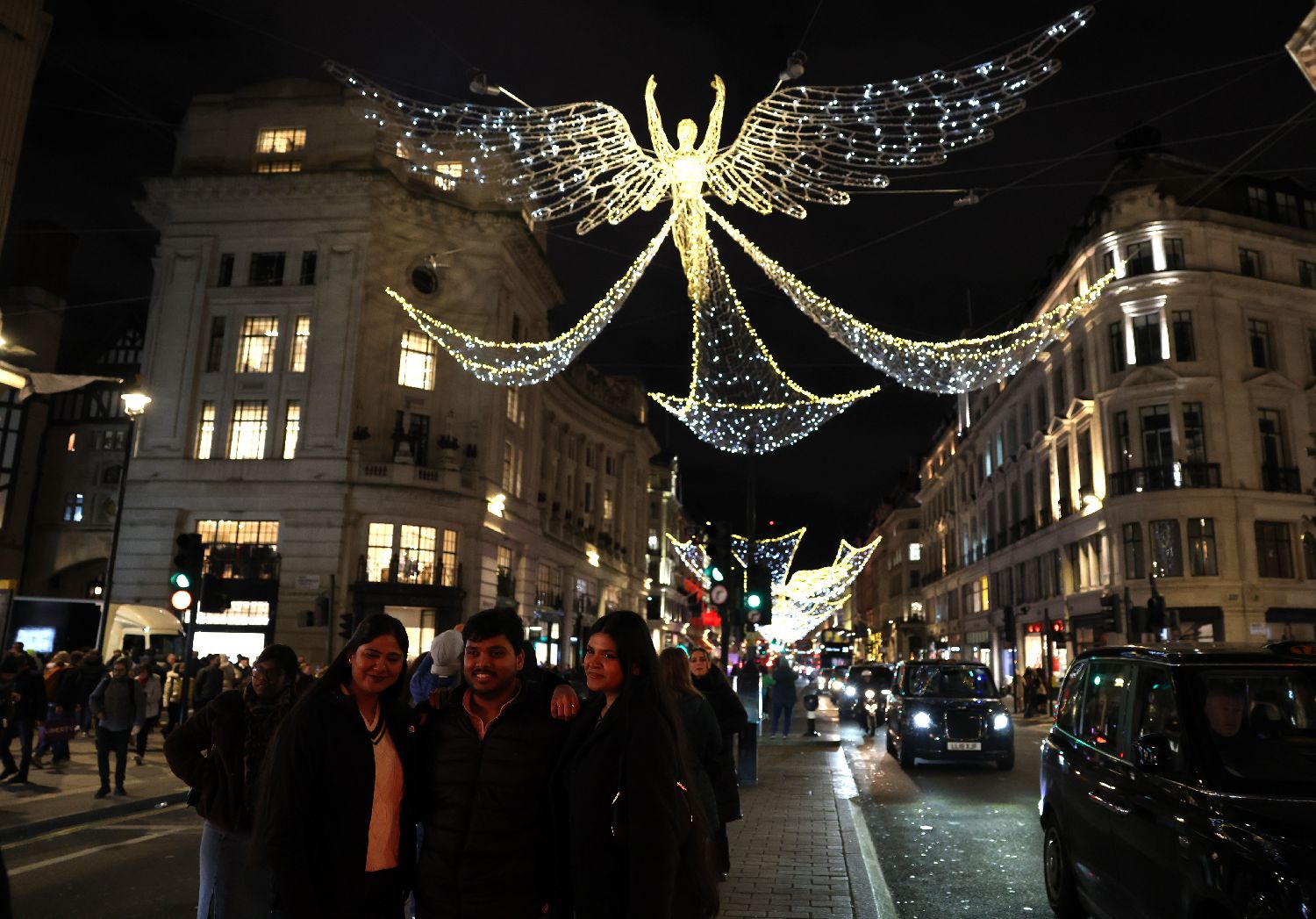 12月17日,在英国伦敦,人们在彩灯下拍照留念。
