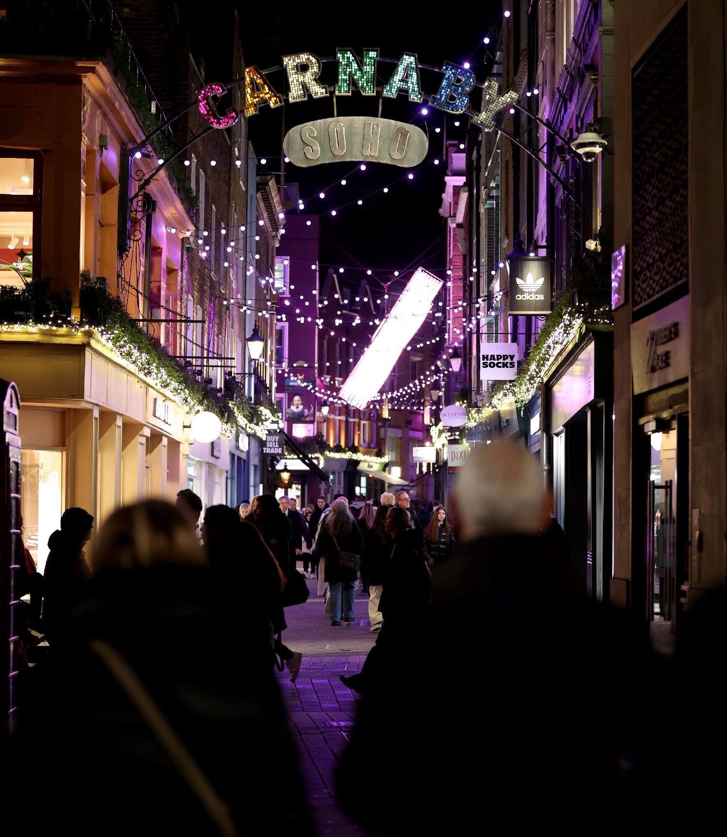 12月17日,在英国伦敦,人们走在悬挂彩灯的步行街上。