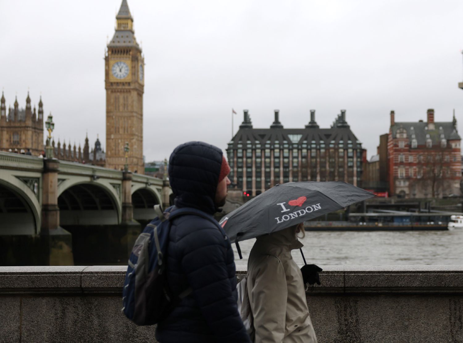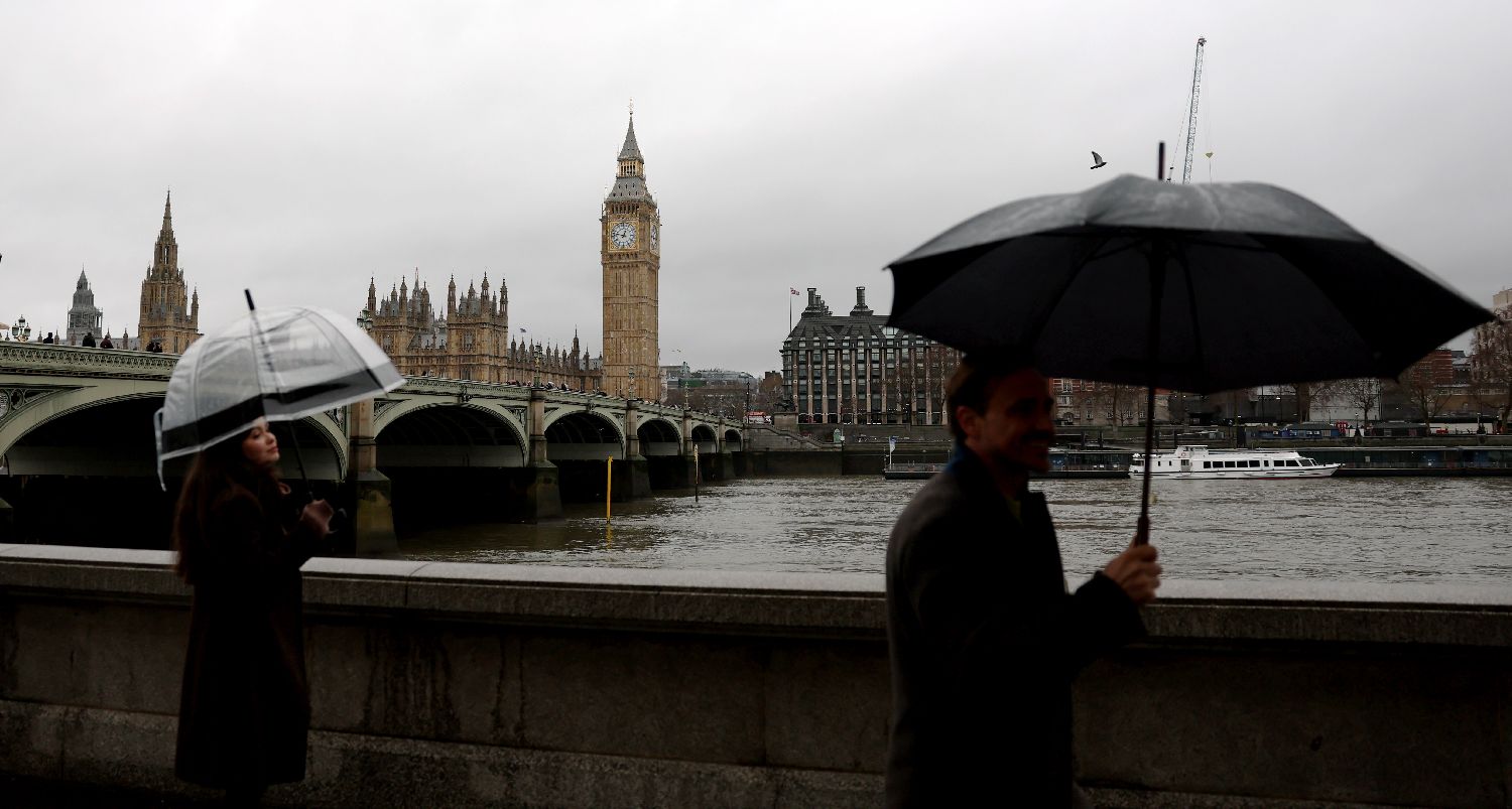 1月27日,人们撑伞走在英国伦敦大本钟附近。
