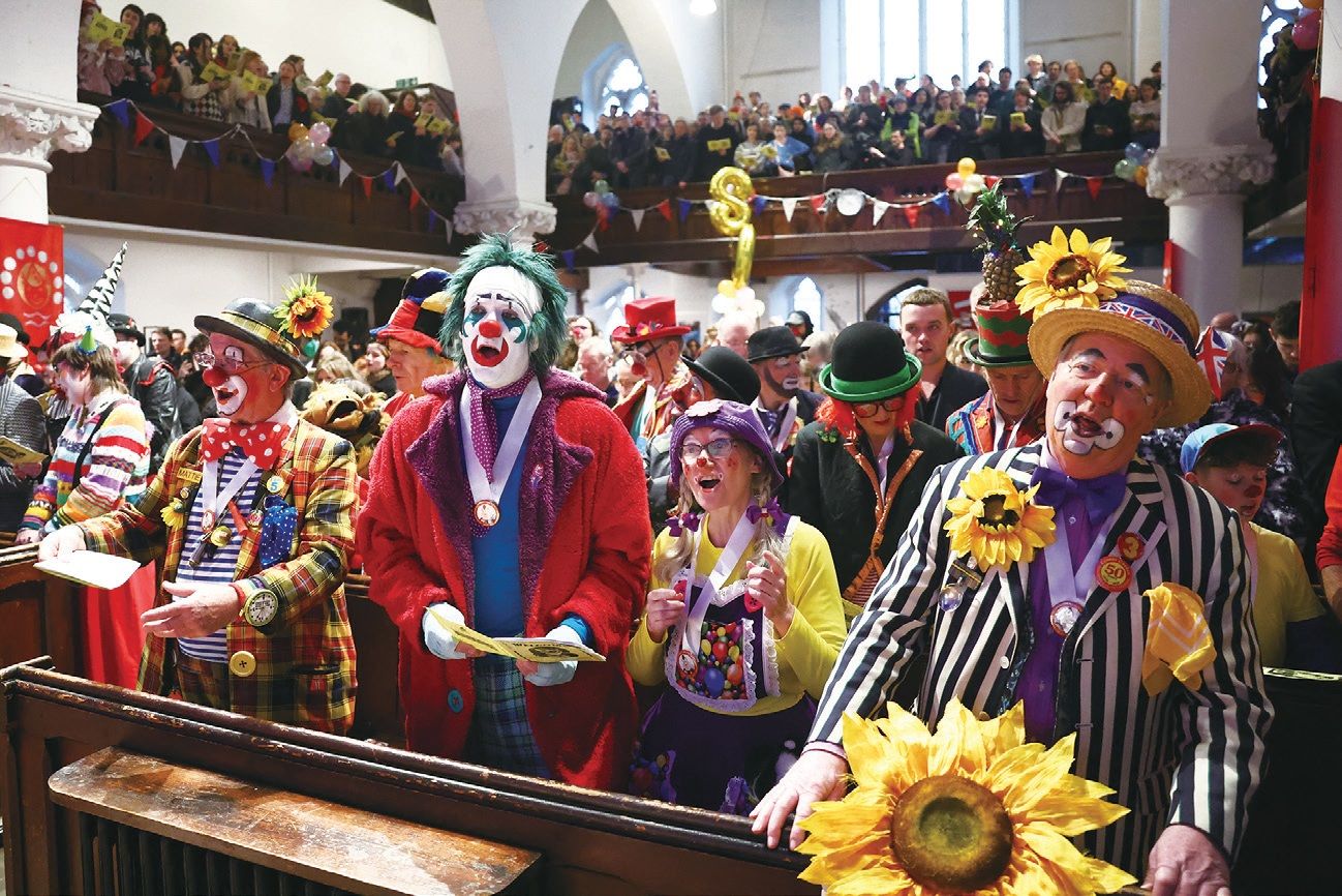 2月1日,在伦敦东部诸圣教堂举行的格里马尔迪年度纪念仪式上,挤满了来自英国各地和国外的马戏团小丑。
