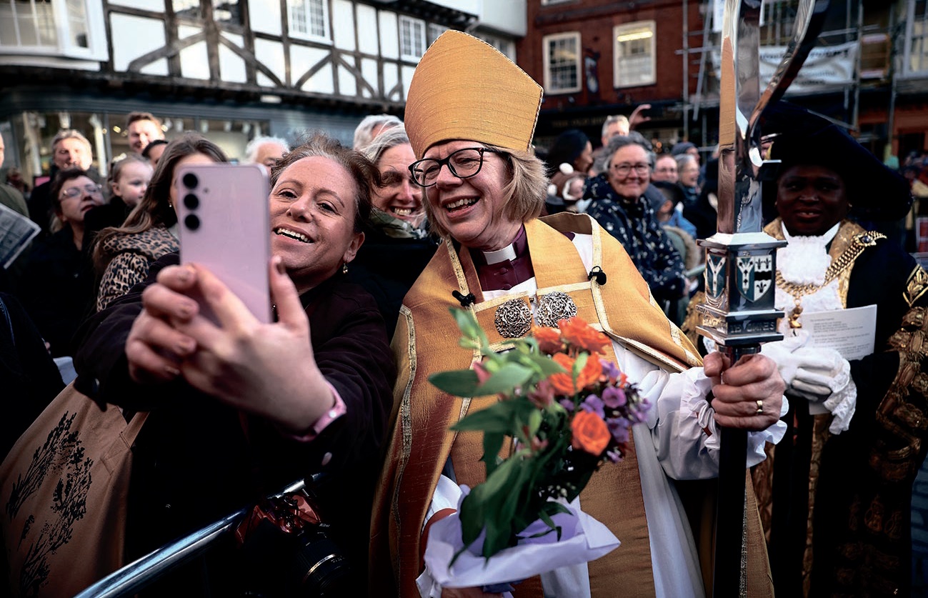 英国首位女性大主教莎拉·穆拉莉(Sarah Mullally)3月25日在英格兰东南部坎特伯雷大教堂举行就职典礼。图为穆拉莉与一位祝贺者合影。法新社图