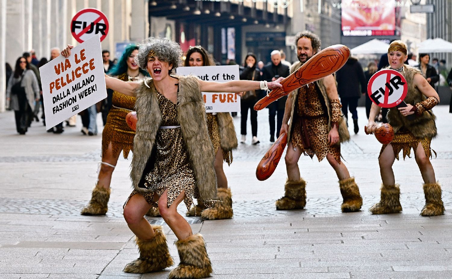 图为时装周首日,动物保护组织PETA活动人士装扮成手持棍棒、裹着人造毛皮的“穴居人”,以快闪形式抗议示威。该机构敦促时装周主办方——意大利国家时装协会效仿伦敦与纽约时装周,全面禁用动物皮草。法新社图