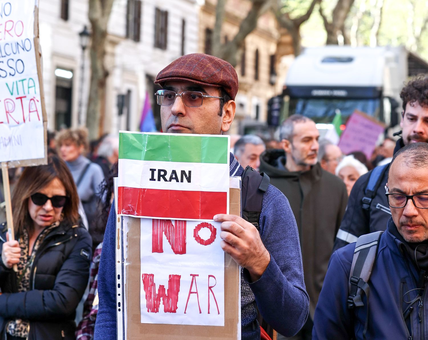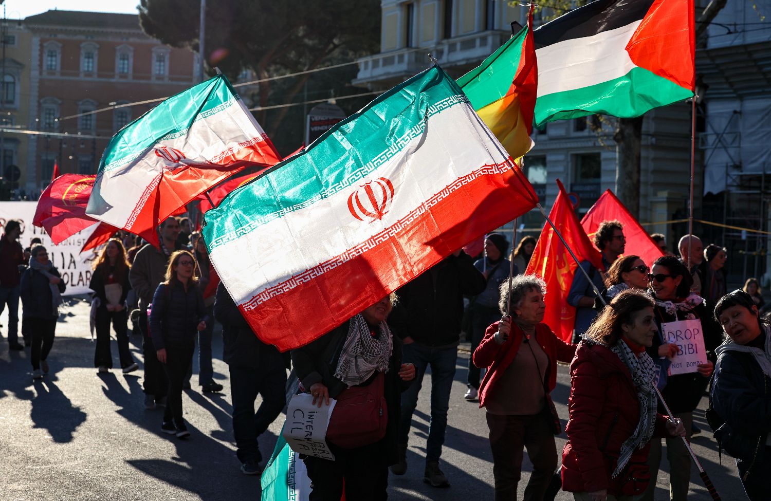 3月28日,意大利首都罗马举行反战游行,人们在活动中声援巴勒斯坦、伊朗等国。