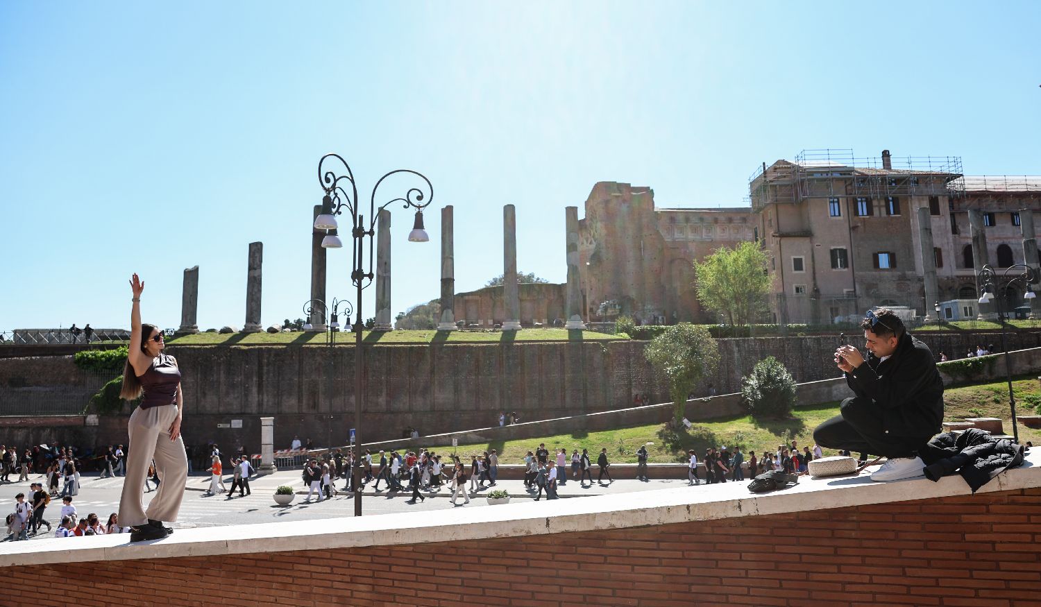 4月4日,游客在意大利首都罗马的古罗马广场附近留影。