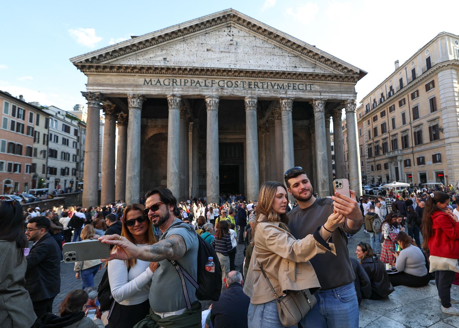 4月3日,游客在意大利首都罗马的万神殿前自拍合影。