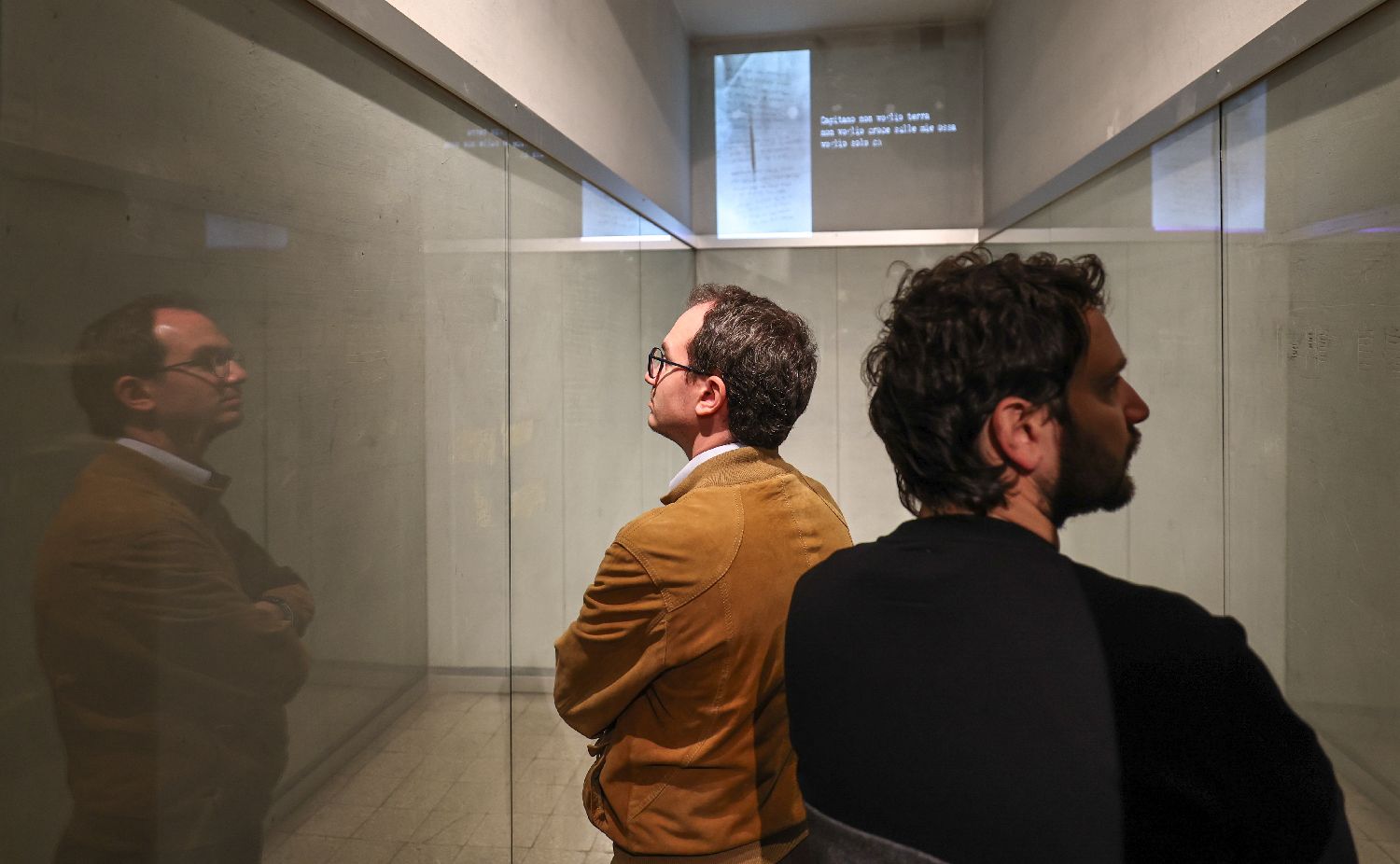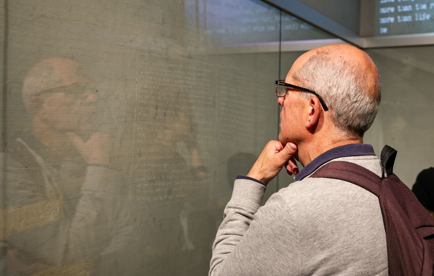 4月25日,在意大利罗马解放纪念馆,人们观看纳粹时期被关押人士在墙上留下的刻字。