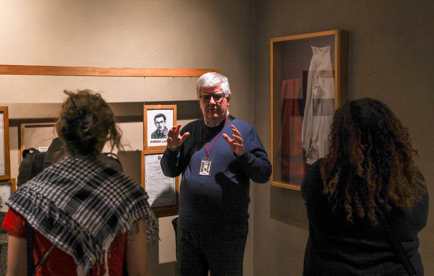 4月25日,志愿者在意大利罗马解放纪念馆为参观人员讲解。