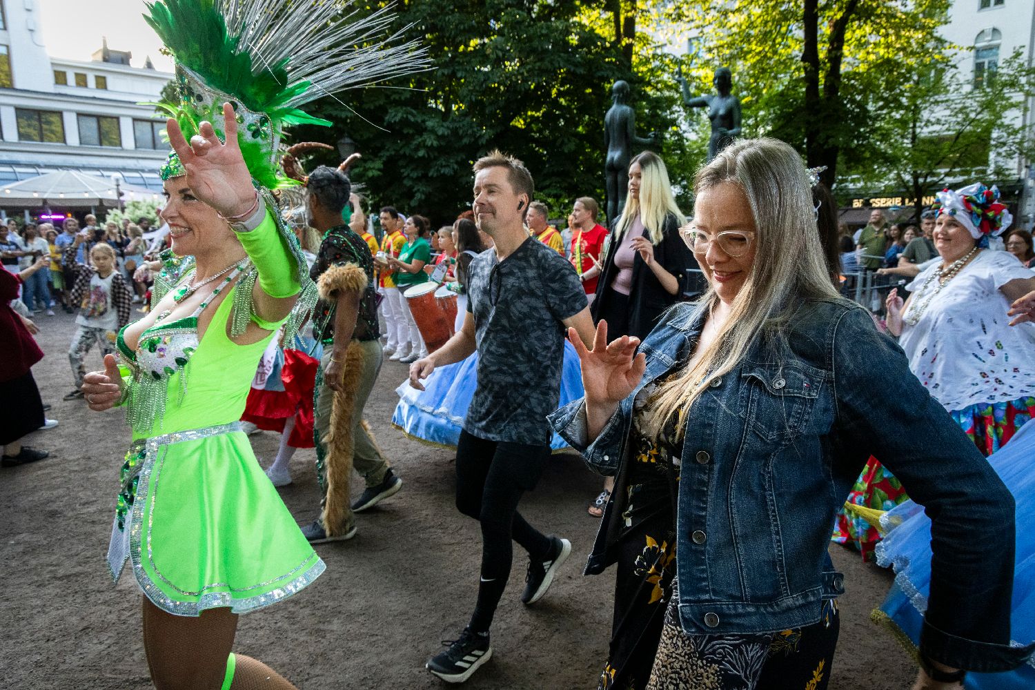 “艺术之夜”活动标志着赫尔辛基艺术节正式拉开帷幕。图为8月14日,在芬兰赫尔辛基,人们在公园内与演员共舞。(图片来源:本文图片均据新华社)