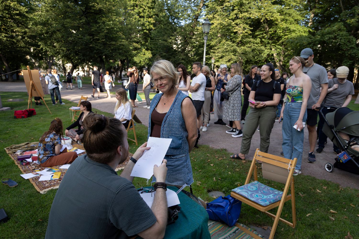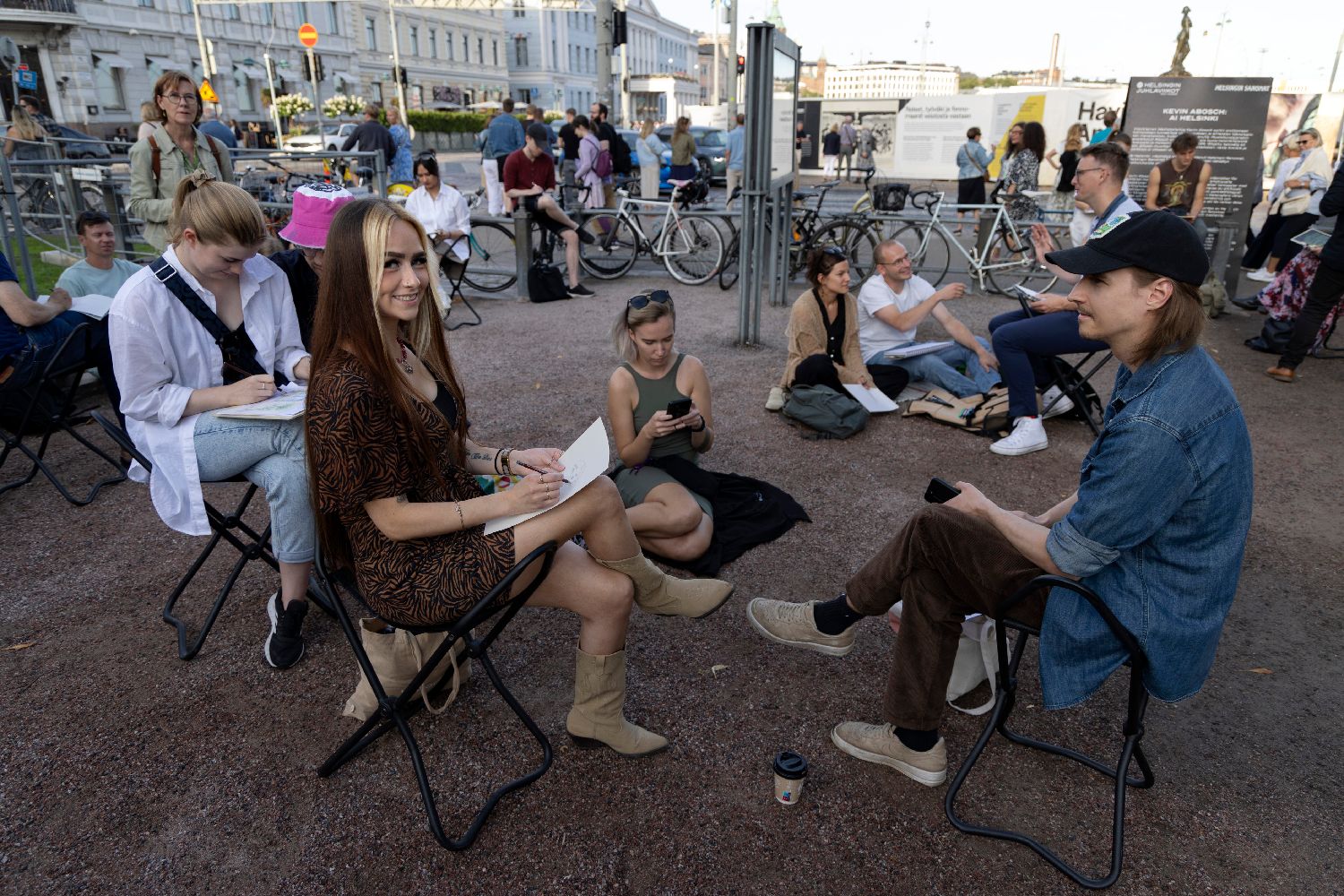 8月15日,人们在芬兰赫尔辛基市中心参与艺术工作坊的诗歌活动。