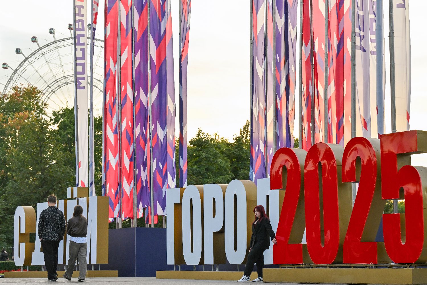 9月13日,在俄罗斯莫斯科国民经济成就展览馆,一名女子在建城周年纪念标识前留影。(图片来源:本文图片均据新华社)