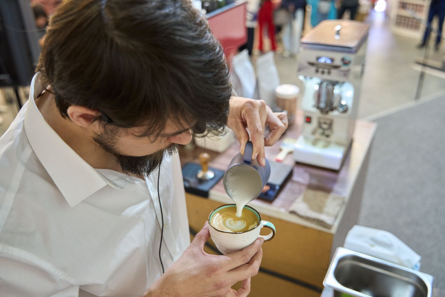 10月9日,咖啡师在俄罗斯符拉迪沃斯托克市茶艺与咖啡品鉴活动上制作咖啡拉花。