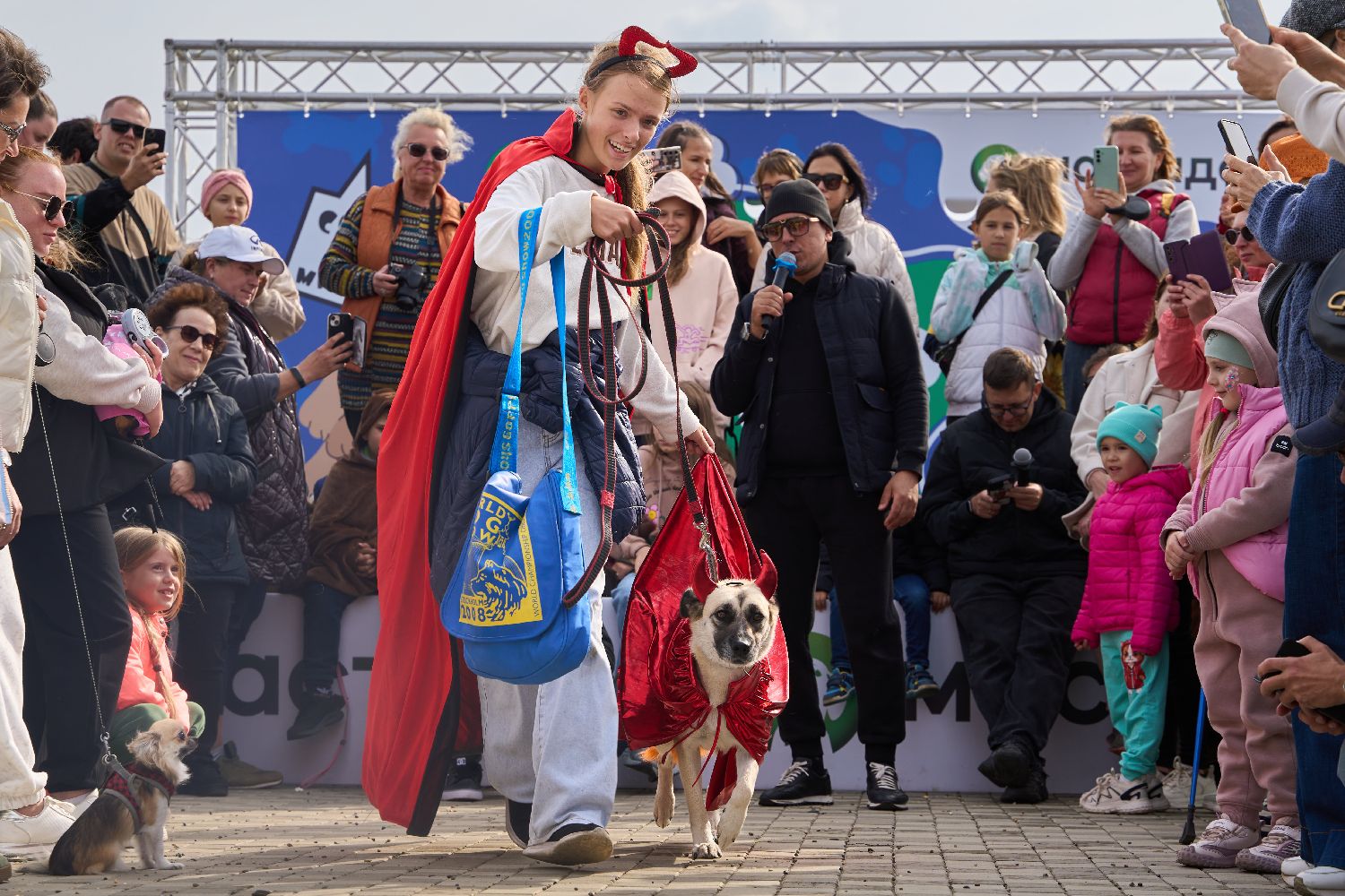 10月12日,在俄罗斯符拉迪沃斯托克市举办的狗狗嘉年华活动上,宠物犬和主人参加时装秀活动。(图片来源:本文图片均据新华社)