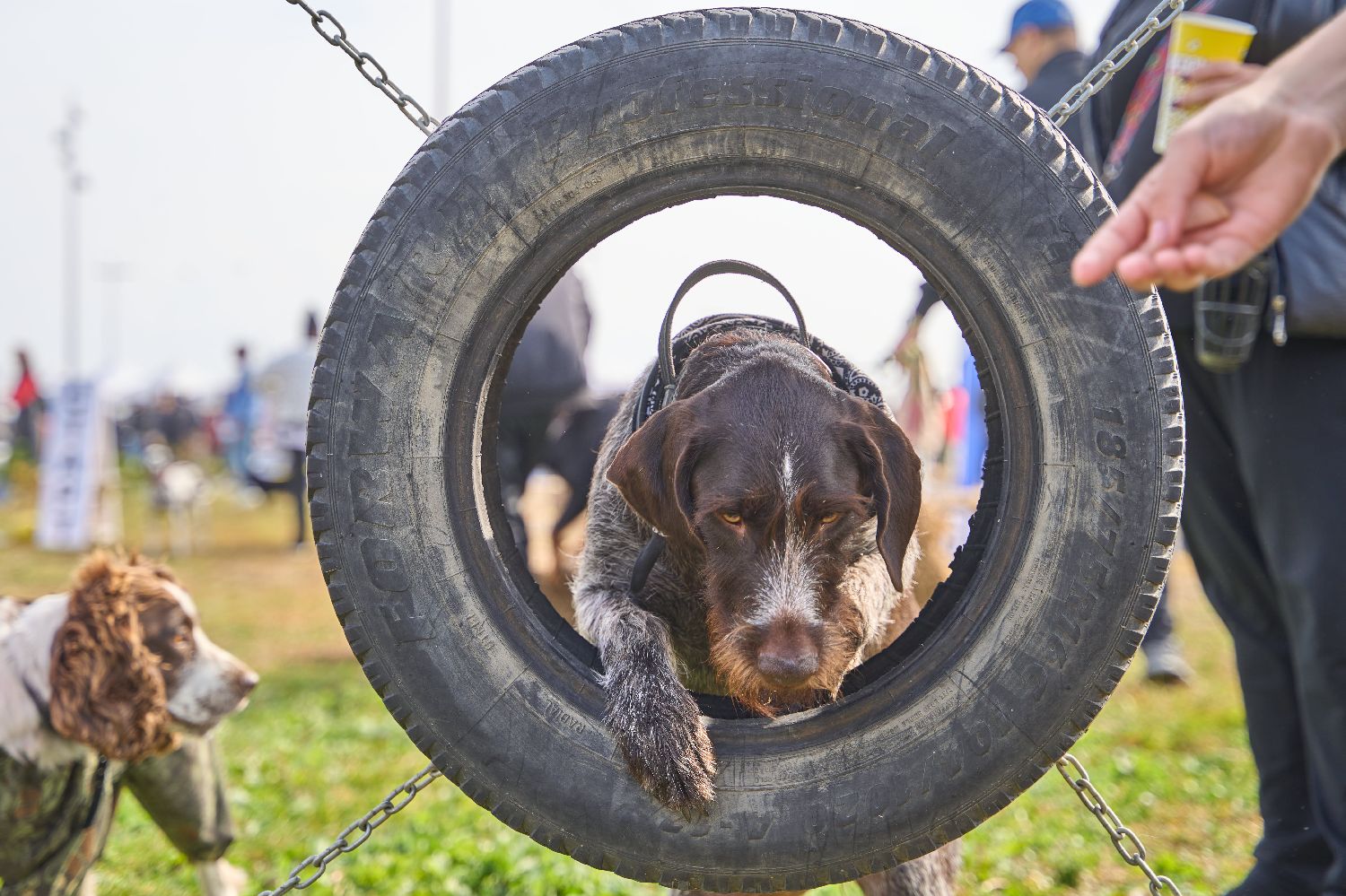 10月12日,在俄罗斯符拉迪沃斯托克市举办的狗狗嘉年华活动上,宠物犬参加钻圈比赛。