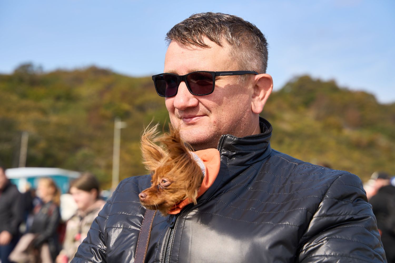 10月12日,在俄罗斯符拉迪沃斯托克市,宠物犬和主人参加狗狗嘉年华。