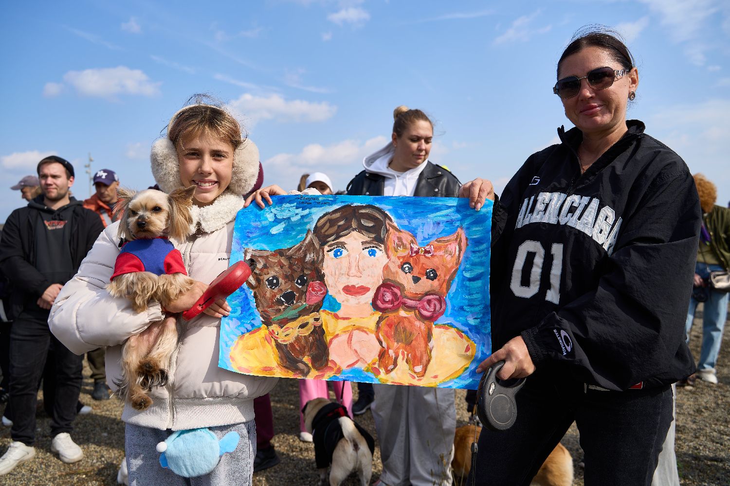 10月12日,人们在俄罗斯符拉迪沃斯托克市举办的狗狗嘉年华活动上展示画作。
