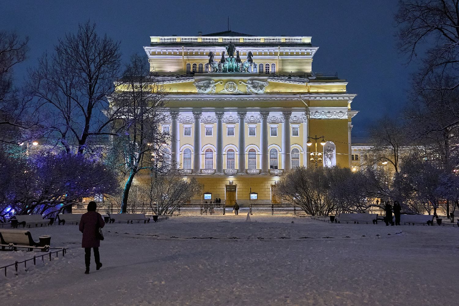 11月18日在俄罗斯圣彼得堡拍摄的雪夜中的亚历山大剧院。