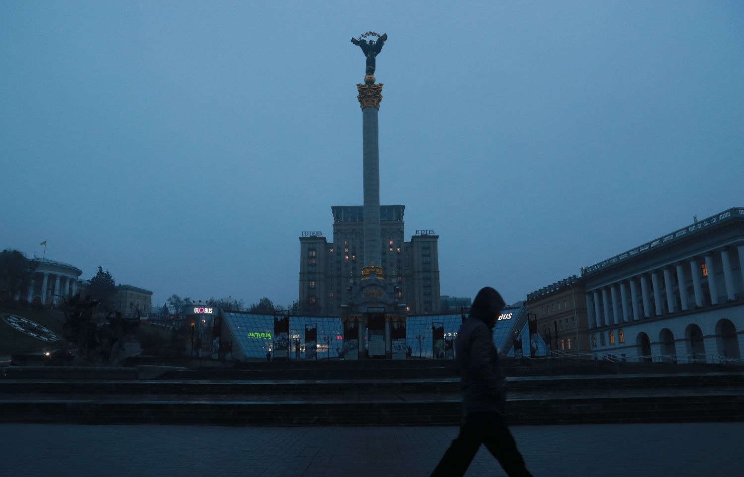11月20日,乌克兰首都基辅主要街道的照明设施出现大面积停电,行人在暮色中走过独立广场。