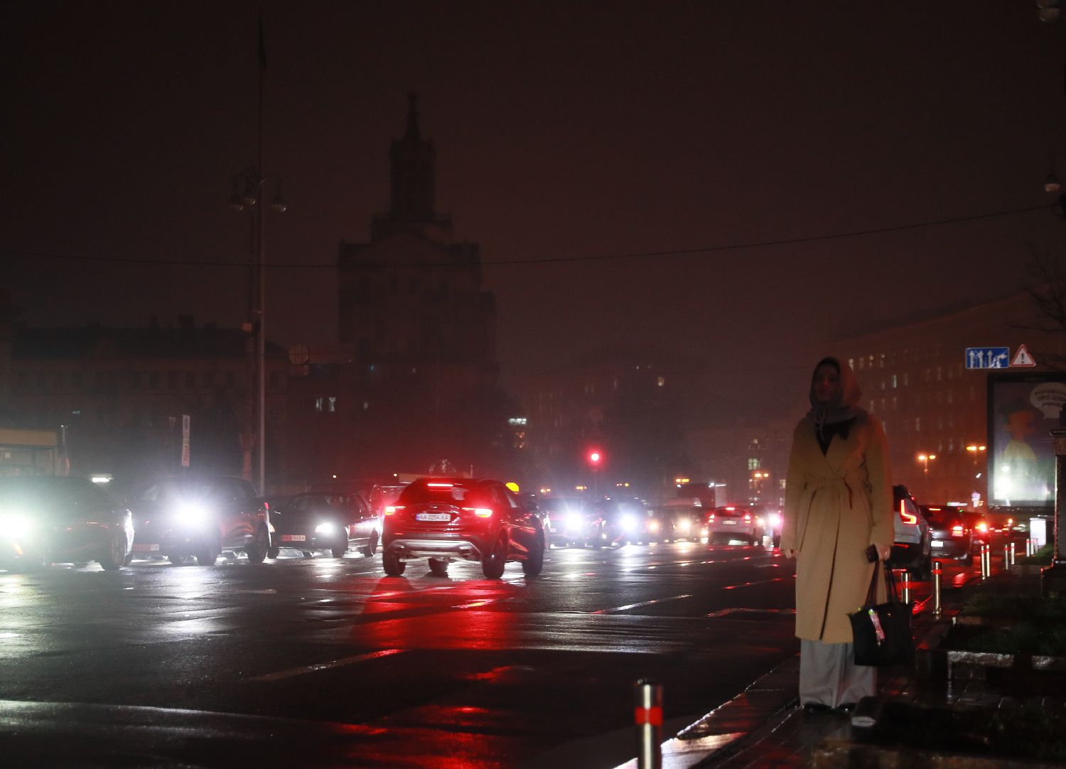 11月20日,乌克兰首都基辅主要街道的照明设施出现大面积停电,夜色中市民在路边等车。