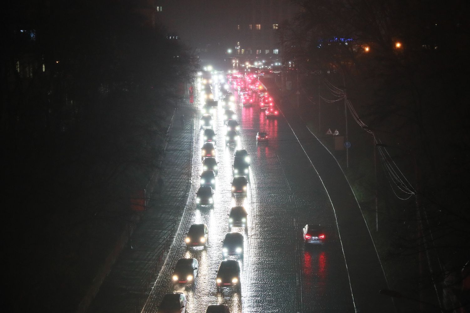 11月20日,乌克兰首都基辅主要街道的照明设施出现大面积停电,车辆在夜色中行驶。