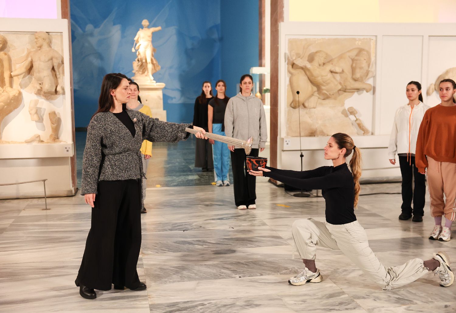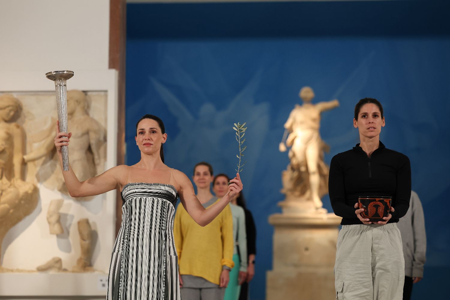 11月25日,扮演最高女祭司的演员玛丽·米娜(右)与第一棒火炬手、希腊运动员彼得罗斯在彩排中。