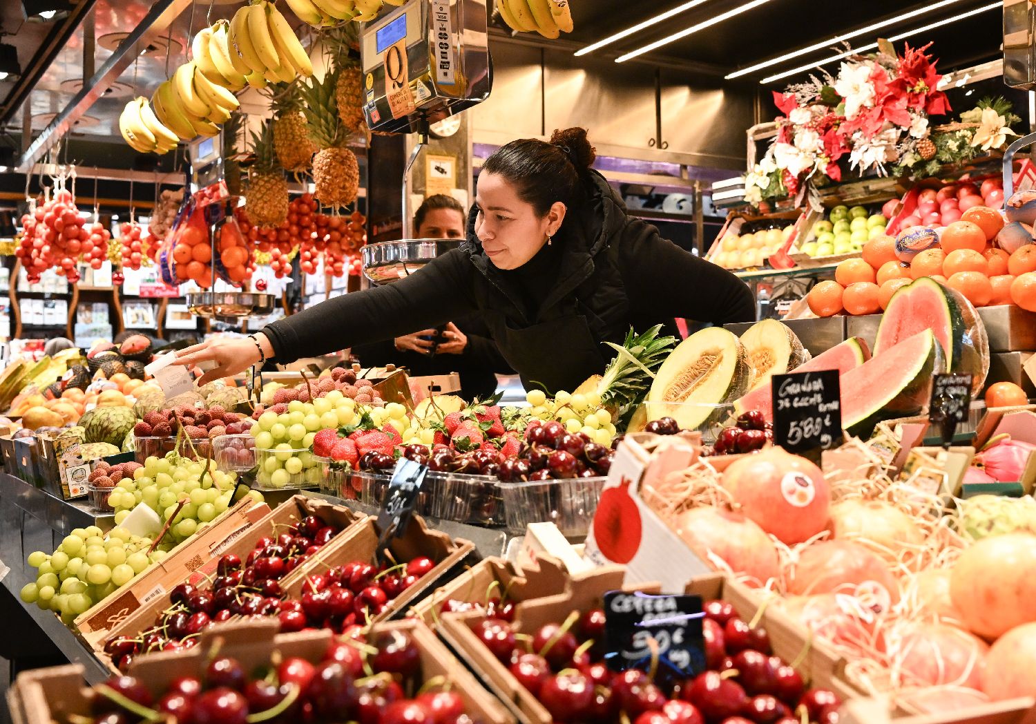 12月2日,摊贩在西班牙巴塞罗那市中心的博凯里亚市场售卖水果。(图片来源:新华社)