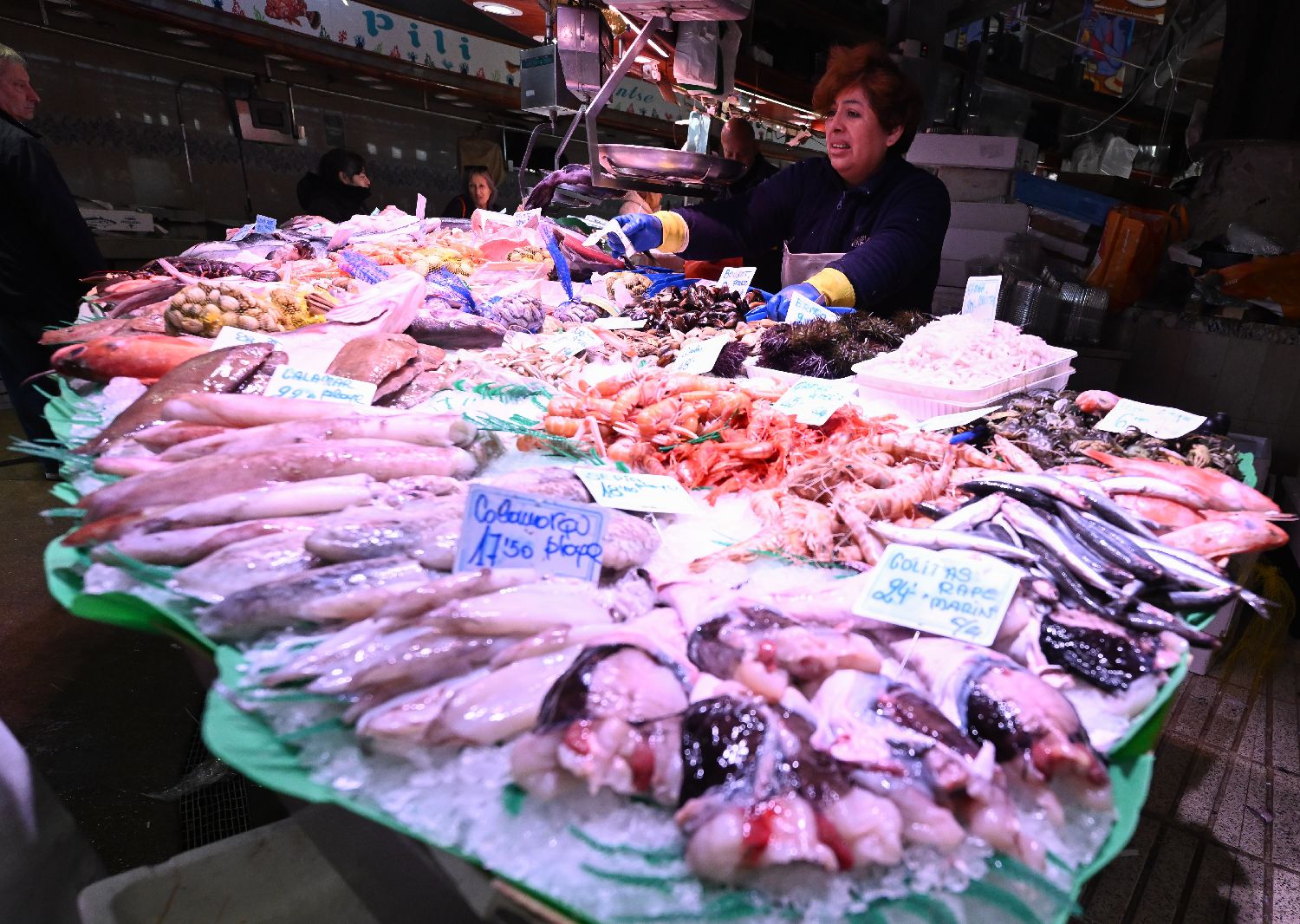 12月2日,摊贩在西班牙巴塞罗那市中心的博凯里亚市场售卖海鲜。(图片来源:新华社)