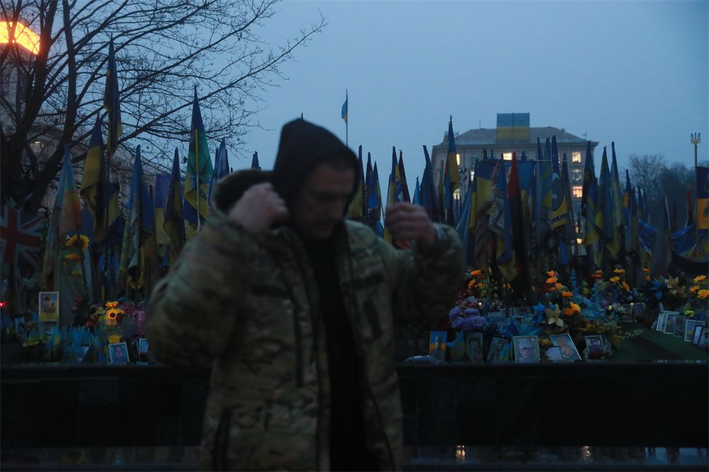 11月20日,在乌克兰基辅,乌军士兵基里洛·邦达连科在插满悼念阵亡军人旗帜的草坪前默哀后准备离开。(图片来源:本文图片均自新华社)
