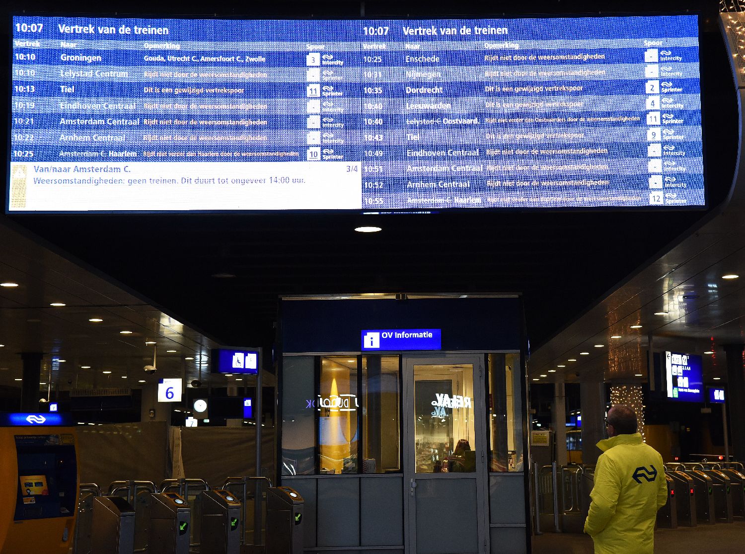 1月6日,荷兰海牙中央火车站电子屏上显示许多列车因天气原因取消。