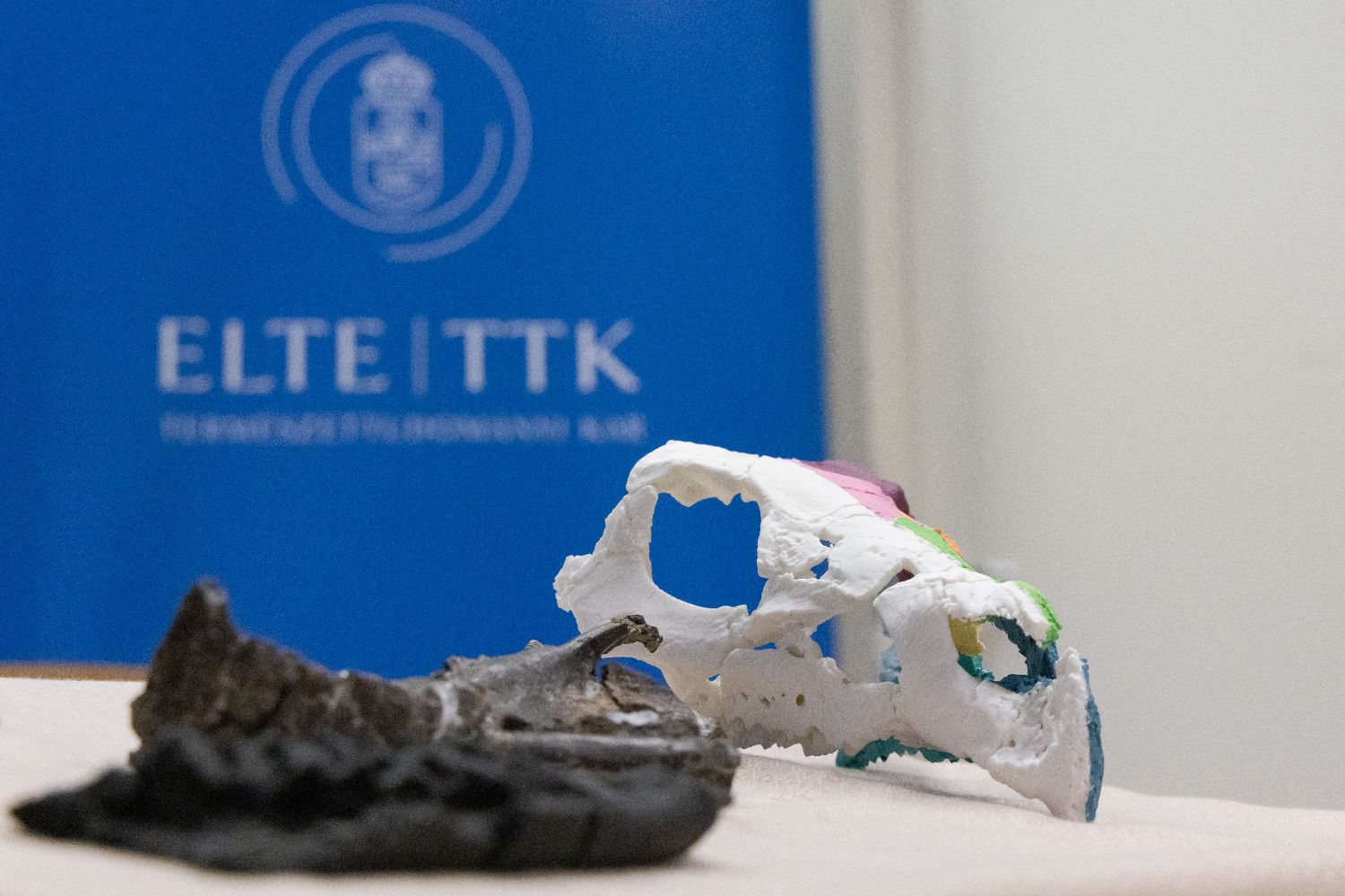 1月7日在匈牙利布达佩斯洛兰大学举行的新闻发布会上拍摄的科兹玛奥伊考角龙头骨化石及其3D复制模型。(图片来源:新华社)