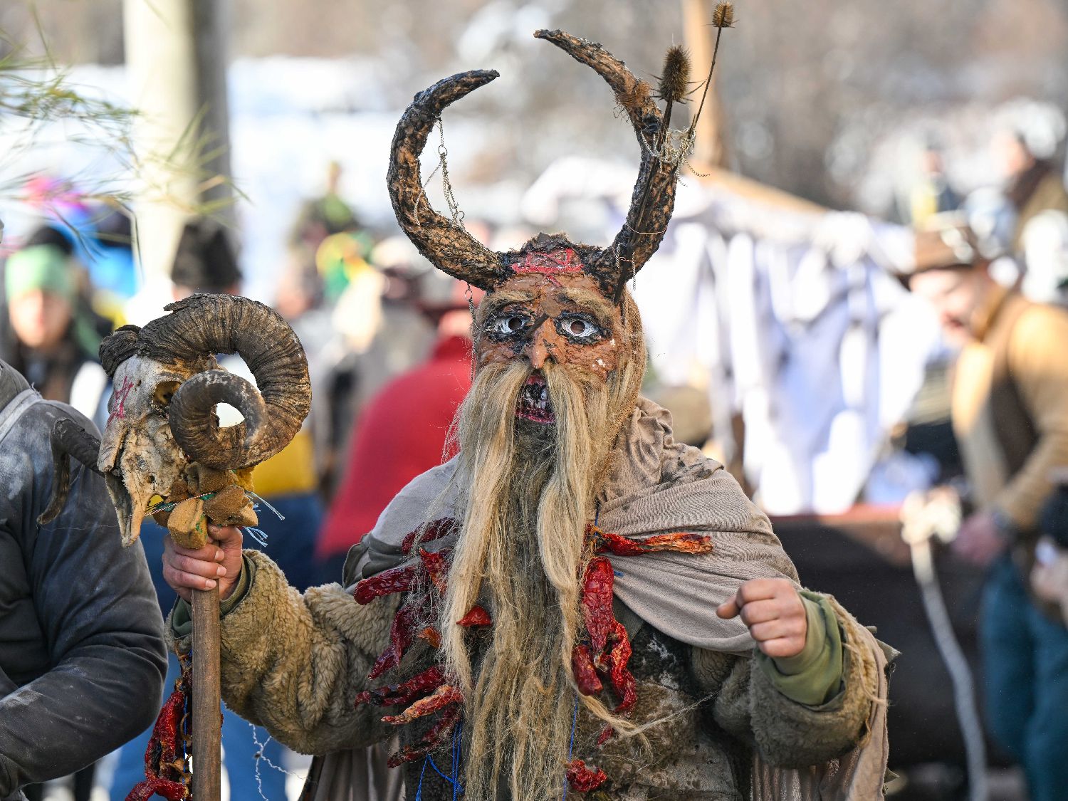 1月13日,在北马其顿的韦韦恰尼村,人们参加狂欢节庆祝活动。