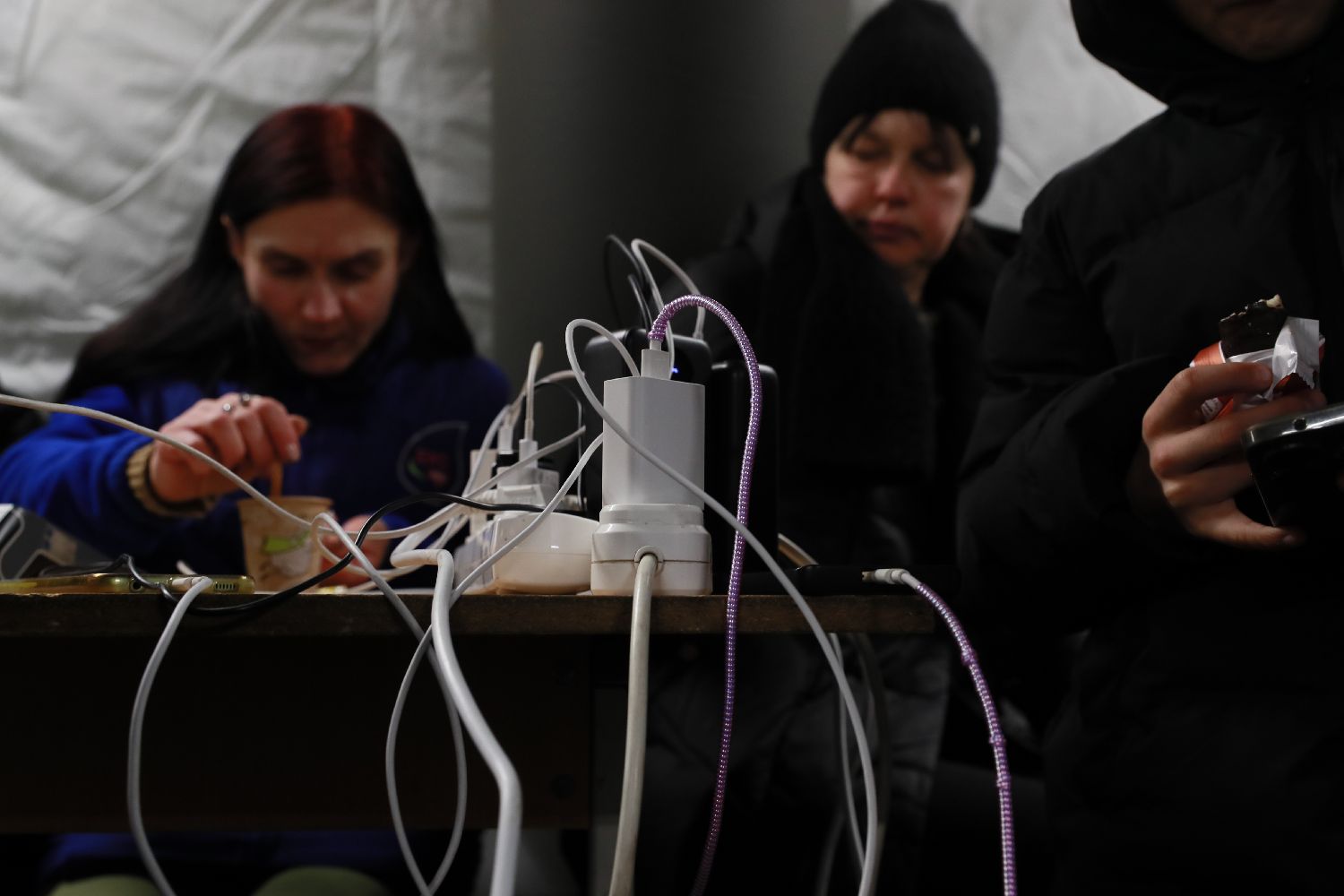 1月20日,人们在乌克兰基辅市一处应急点给电子设备充电。