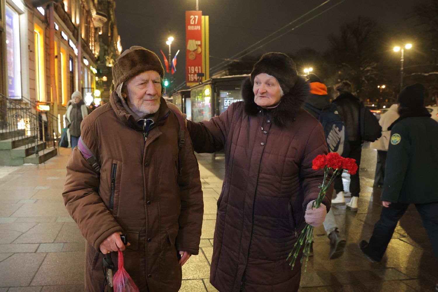 1月27日,在俄罗斯圣彼得堡,两名列宁格勒围困期间的幸存者参加纪念活动。