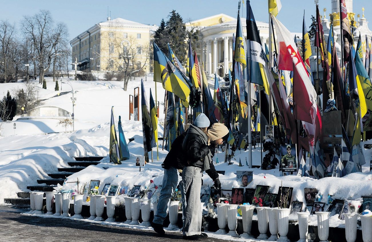 2月9日,法国国防部长沃特兰访问乌克兰。法乌两国签署意向书,联合开发和生产武器。图为当天行人向基辅独立广场的阵亡军人纪念碑致敬。法新社图