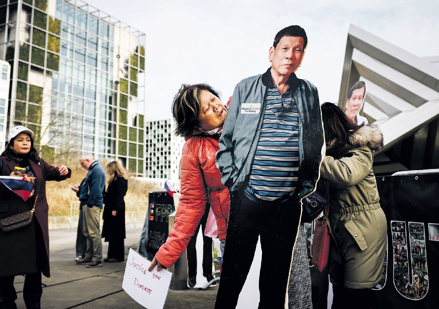 位于荷兰海牙的国际刑事法院23日举行菲律宾前总统杜特尔特案听证会。听证会将持续4天。国际刑事法院指控杜特尔特犯有“反人类罪”。法庭将根据听证会内容,确定是否有充分理由相信杜特尔特实施了被指控的罪行。如果指控得到全部或部分确认,案件将进入正式审理程序。一般听证会后60天内法庭将作出是否确认指控的决定。图为支持者竖起杜特尔特的真人大小纸板人像,在法院外声援他。法新社图