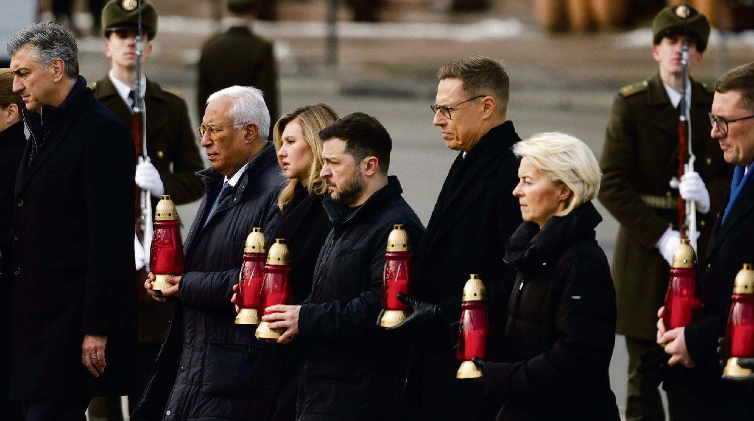欧盟委员会主席冯德莱恩、欧盟理事会主席科斯塔以及丹麦、爱沙尼亚、芬兰、冰岛、拉脱维亚、挪威和瑞典等国领导人搭乘夜行火车于24日上午抵达基辅,在俄罗斯全面入侵4周年之际展现对乌克兰的支持。