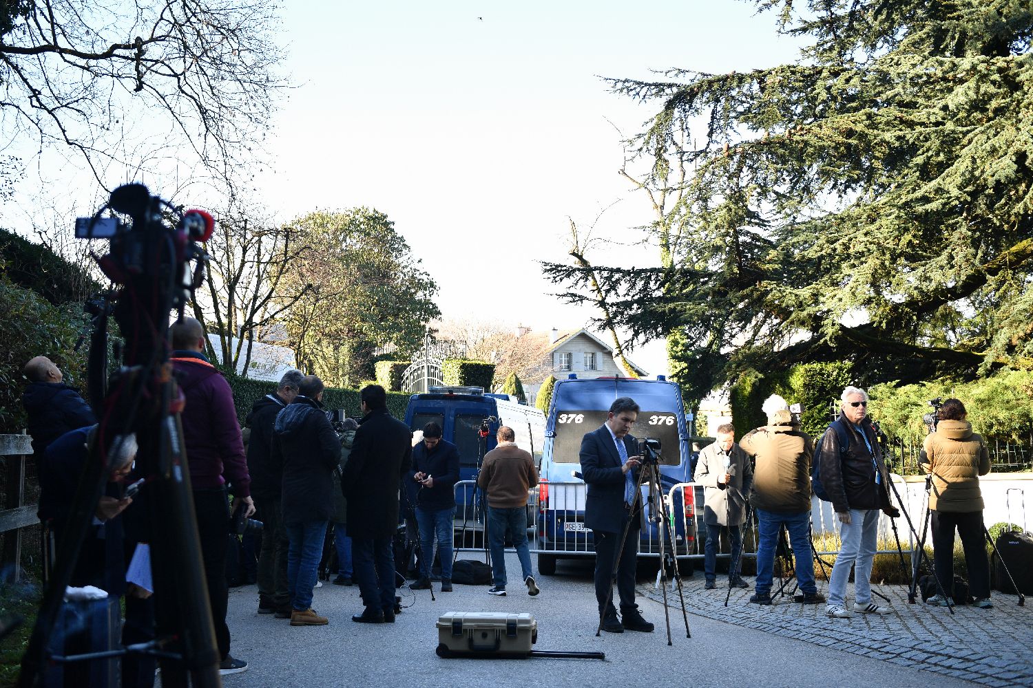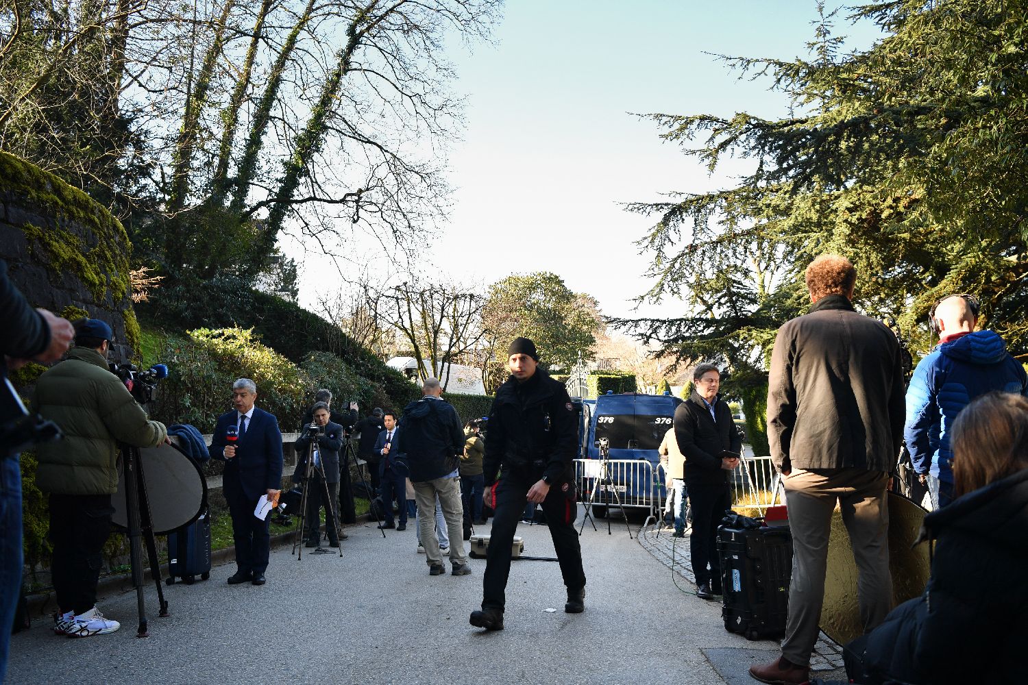 2月26日,记者和安保人员在瑞士日内瓦阿曼驻日内瓦外交代表机构附近。