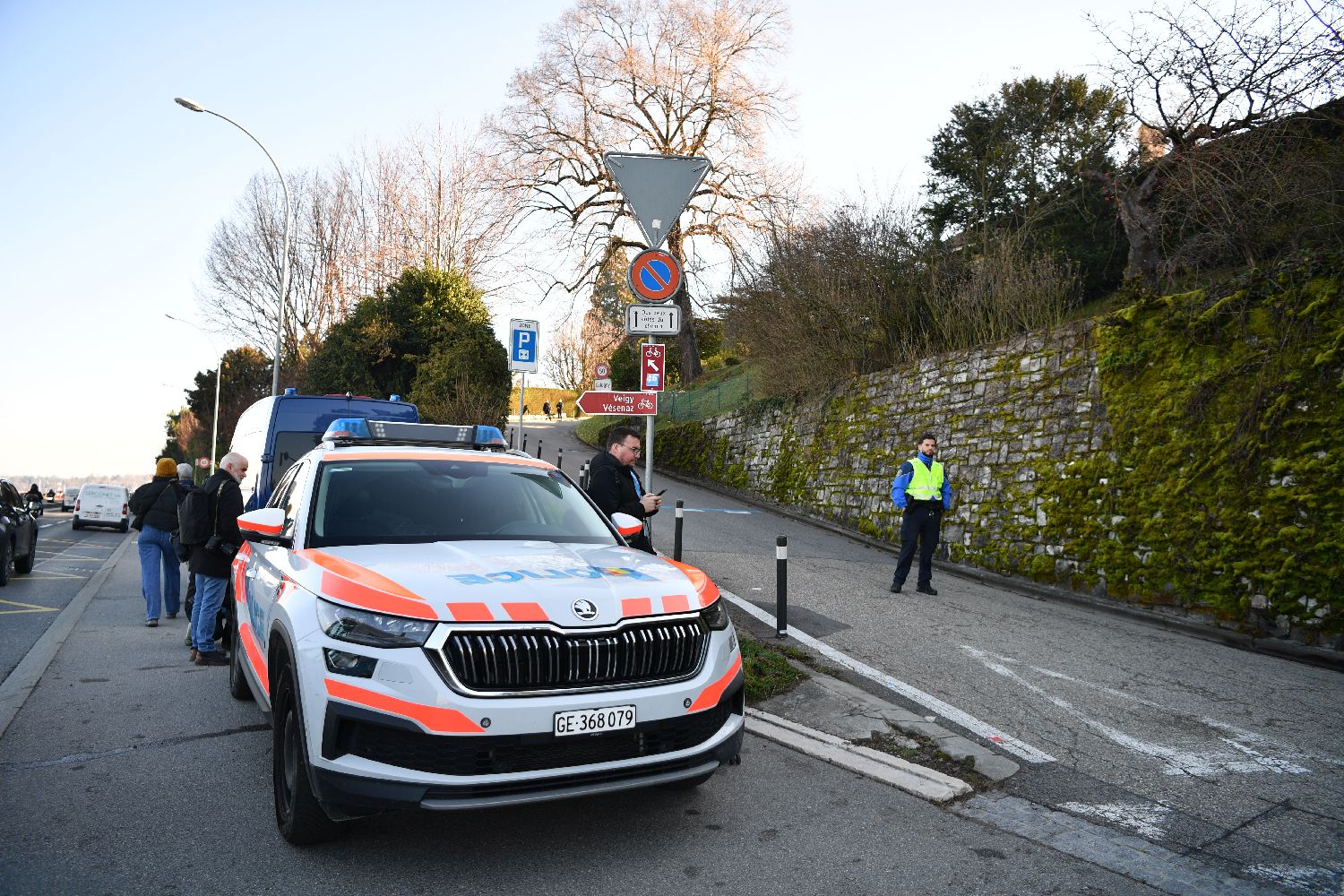 2月26日在瑞士日内瓦阿曼驻日内瓦外交代表机构附近拍摄的警车。
