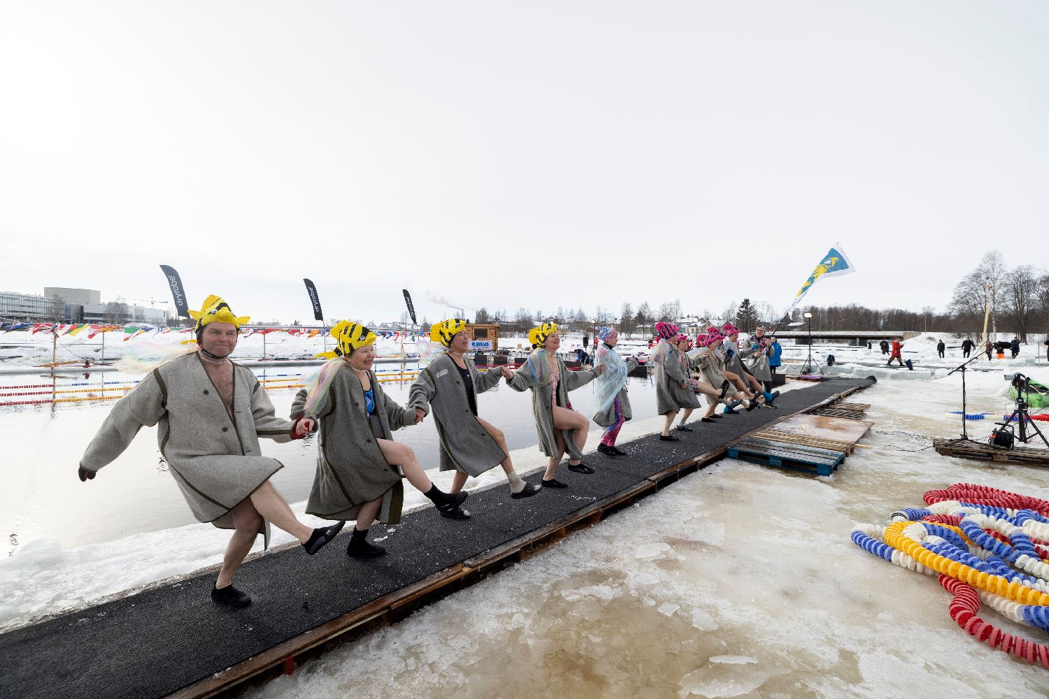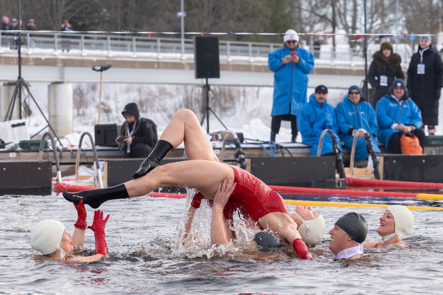 3月7日,在芬兰奥卢,人们在冬泳活动期间进行表演。