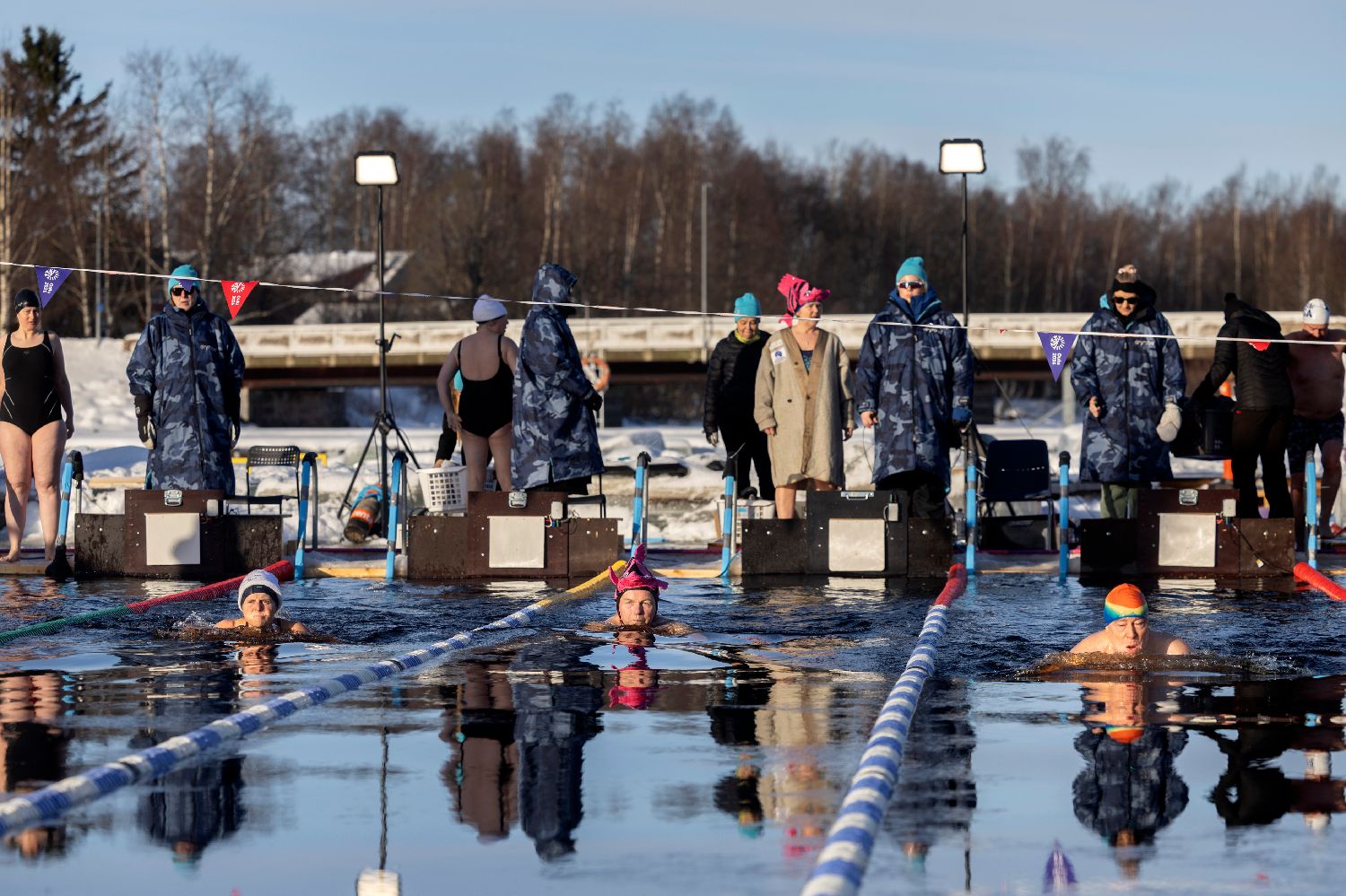 3月7日,在芬兰奥卢,冬泳爱好者在进行一场比赛。