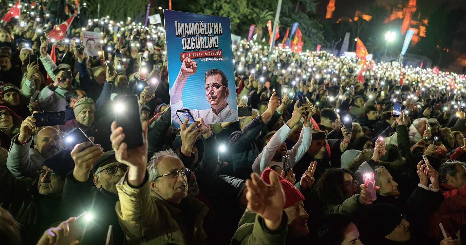 当地时间3月18日,土耳其最大城市伊斯坦布尔数千人举行集会,纪念该市前市长、土耳其总统埃尔多安的主要政敌埃克雷姆·伊马姆奥卢因贪腐罪名被捕一周年。图为示威人群手举点亮的手机和伊马姆奥卢画像。法新社图