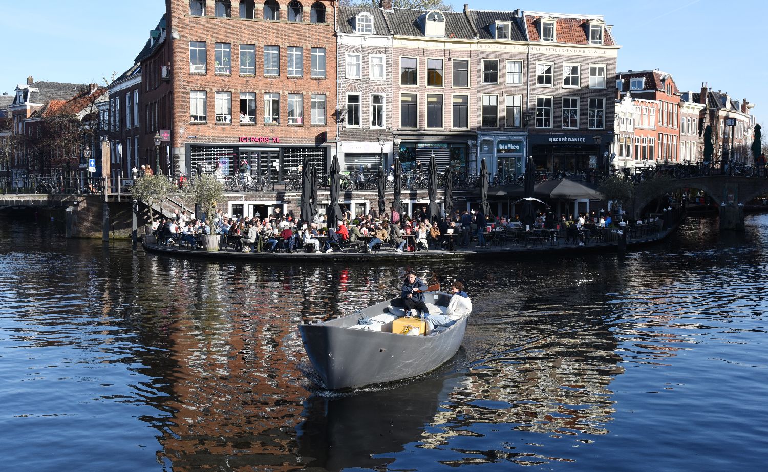 4月6日,在荷兰莱顿,人们乘船欣赏城市风景。
