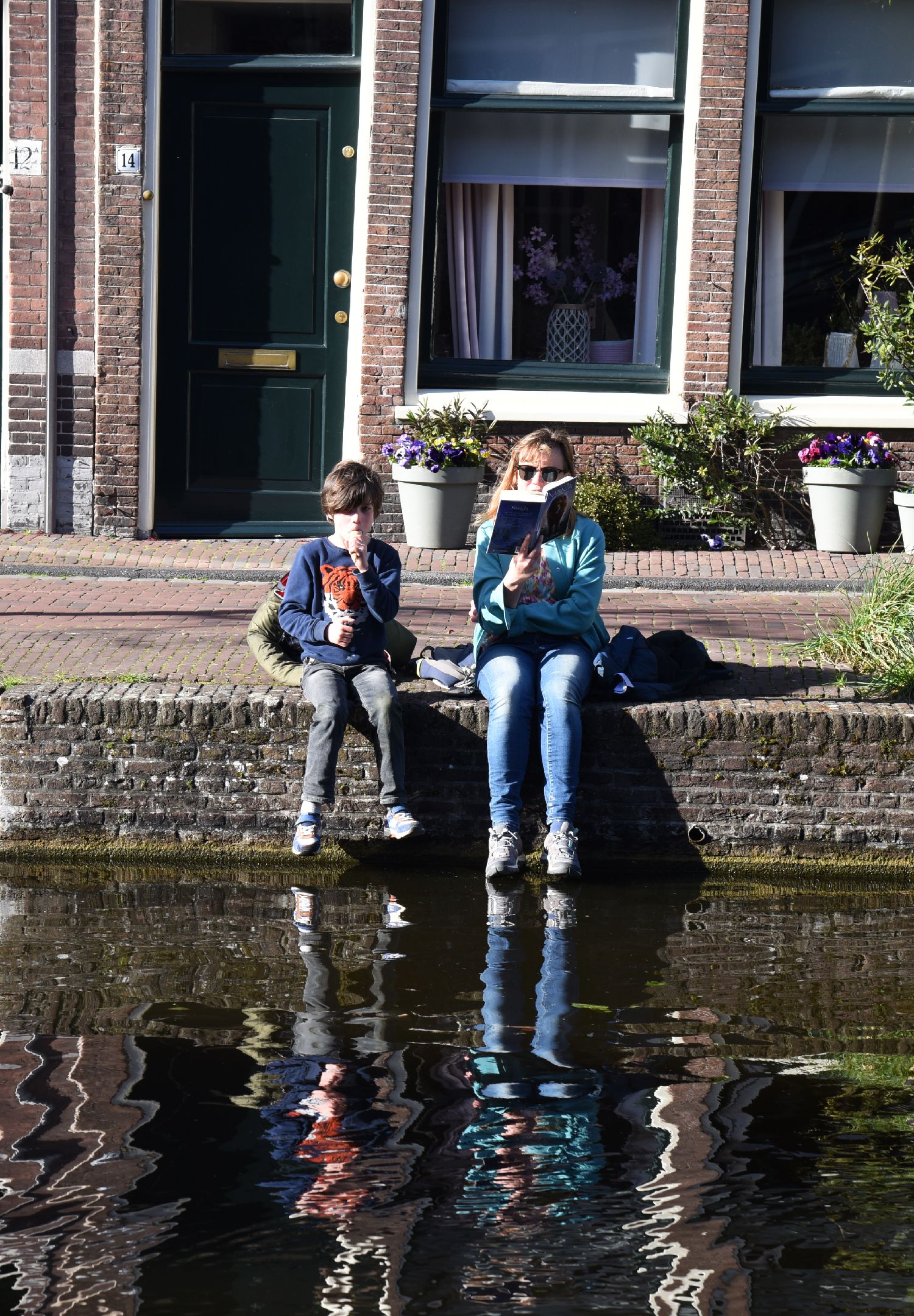 4月6日,在荷兰莱顿,人们坐在运河边休闲。