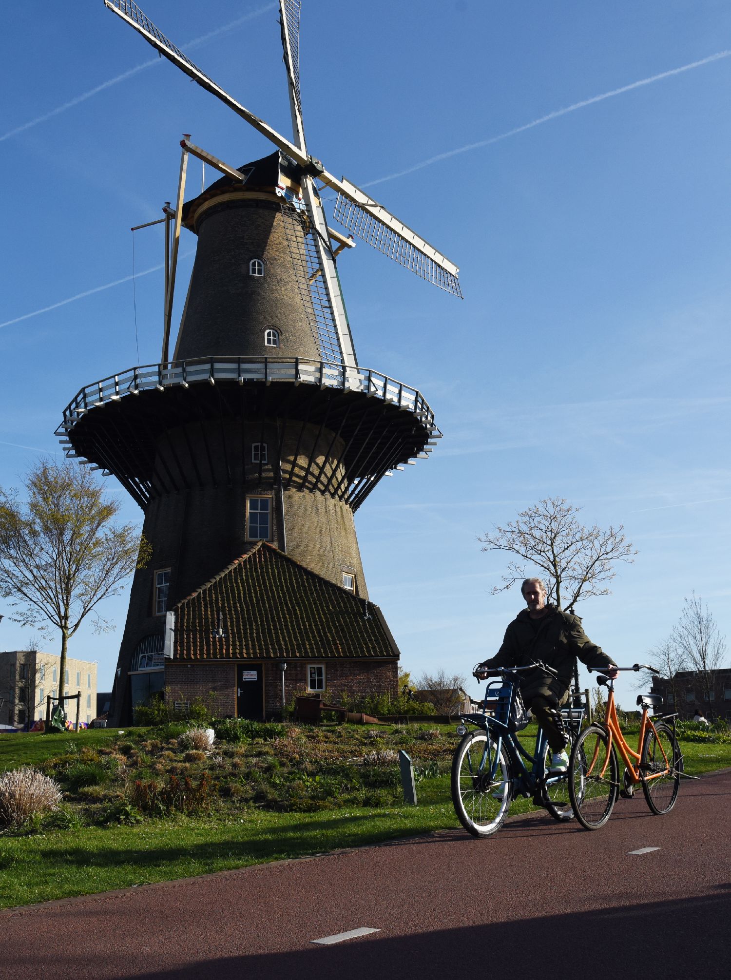 4月6日,在荷兰莱顿,一名男子骑车从风车旁经过。