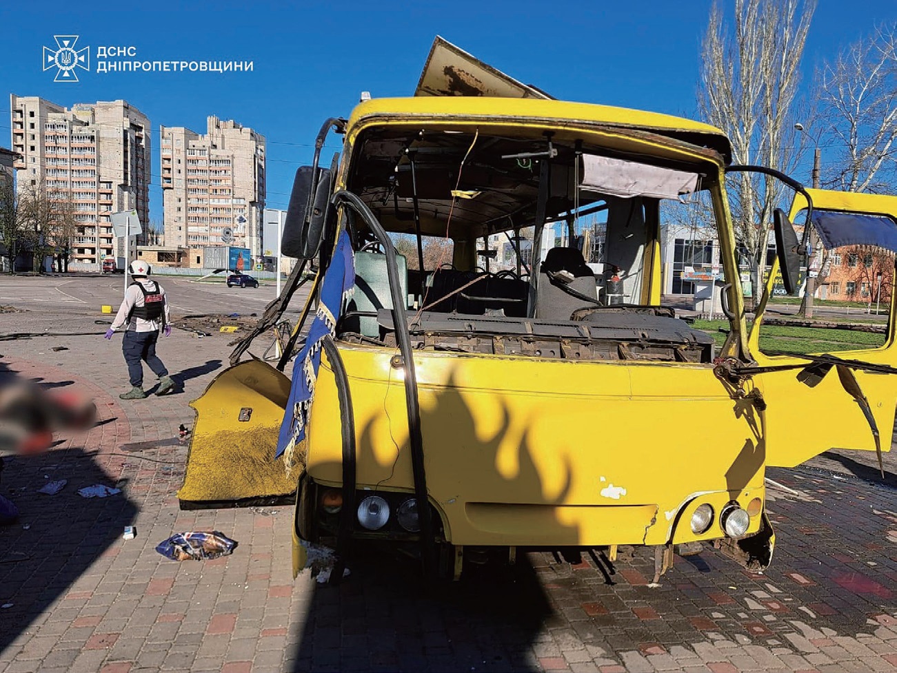 泽连斯基分享的现场照片显示,公车烧毁,车窗破碎,3具遗体倒卧在人行道上,救援人员则在协助伤者。