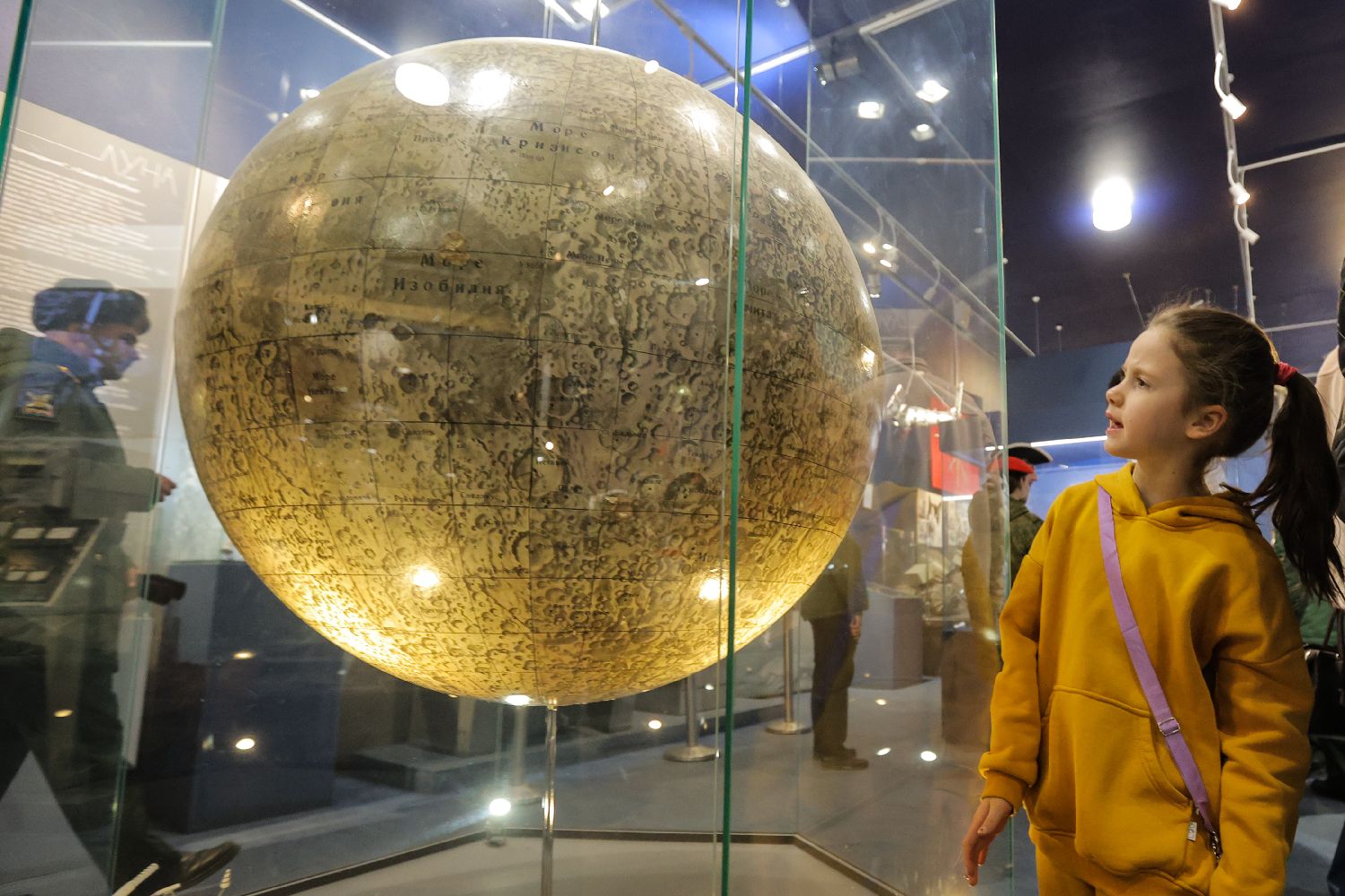 4月12日,在俄罗斯圣彼得堡的格卢什科宇航与火箭技术博物馆,一位女孩观看月球模型。