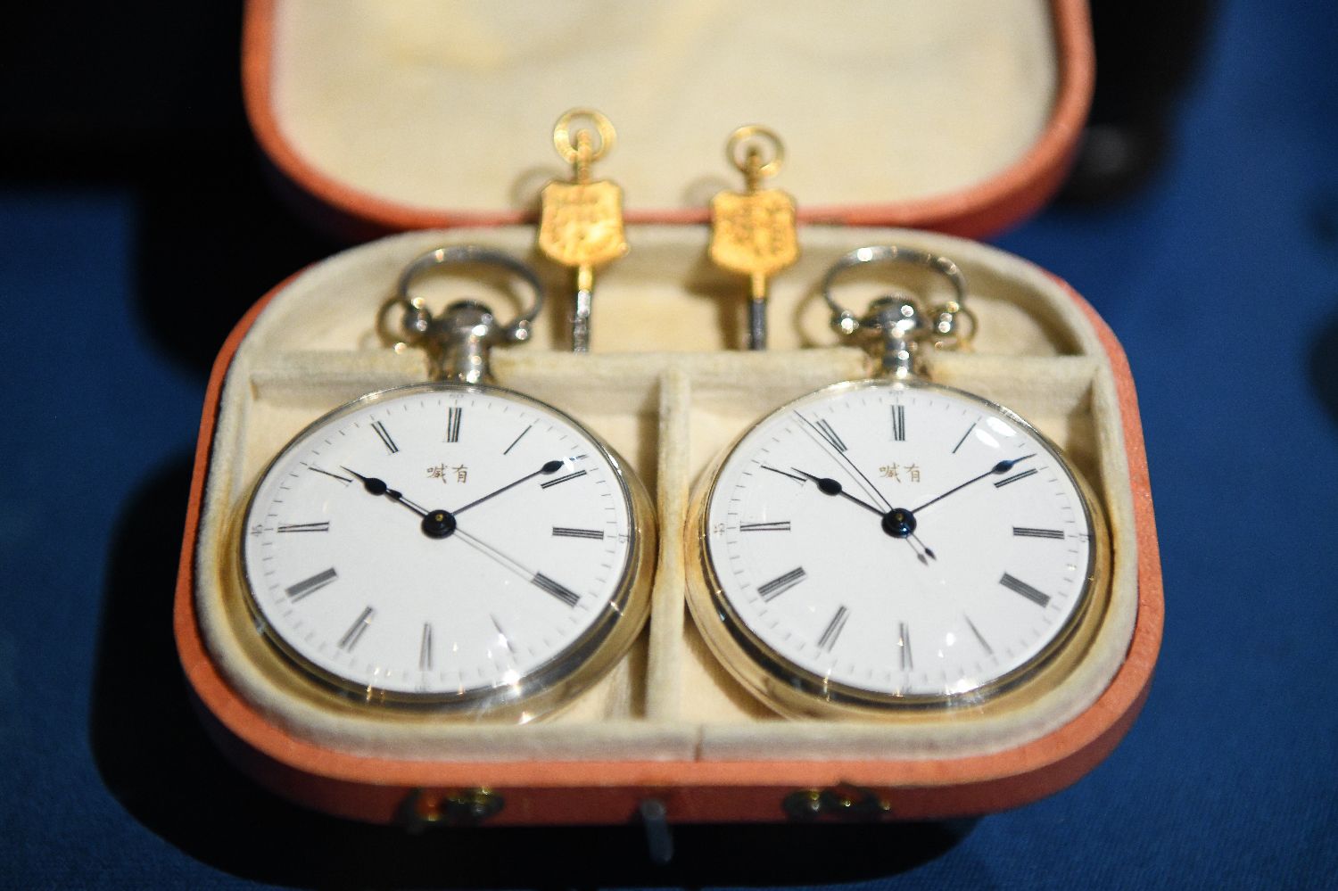 4月12日在瑞士拉绍德封的国际钟表博物馆内拍摄的一对播威品牌怀表。这对怀表大约制作于1880年,是当时向中国出口的款式,寓意“成双成对”。