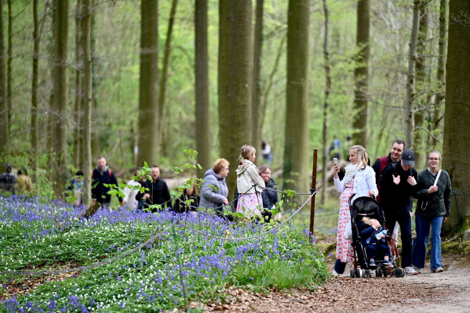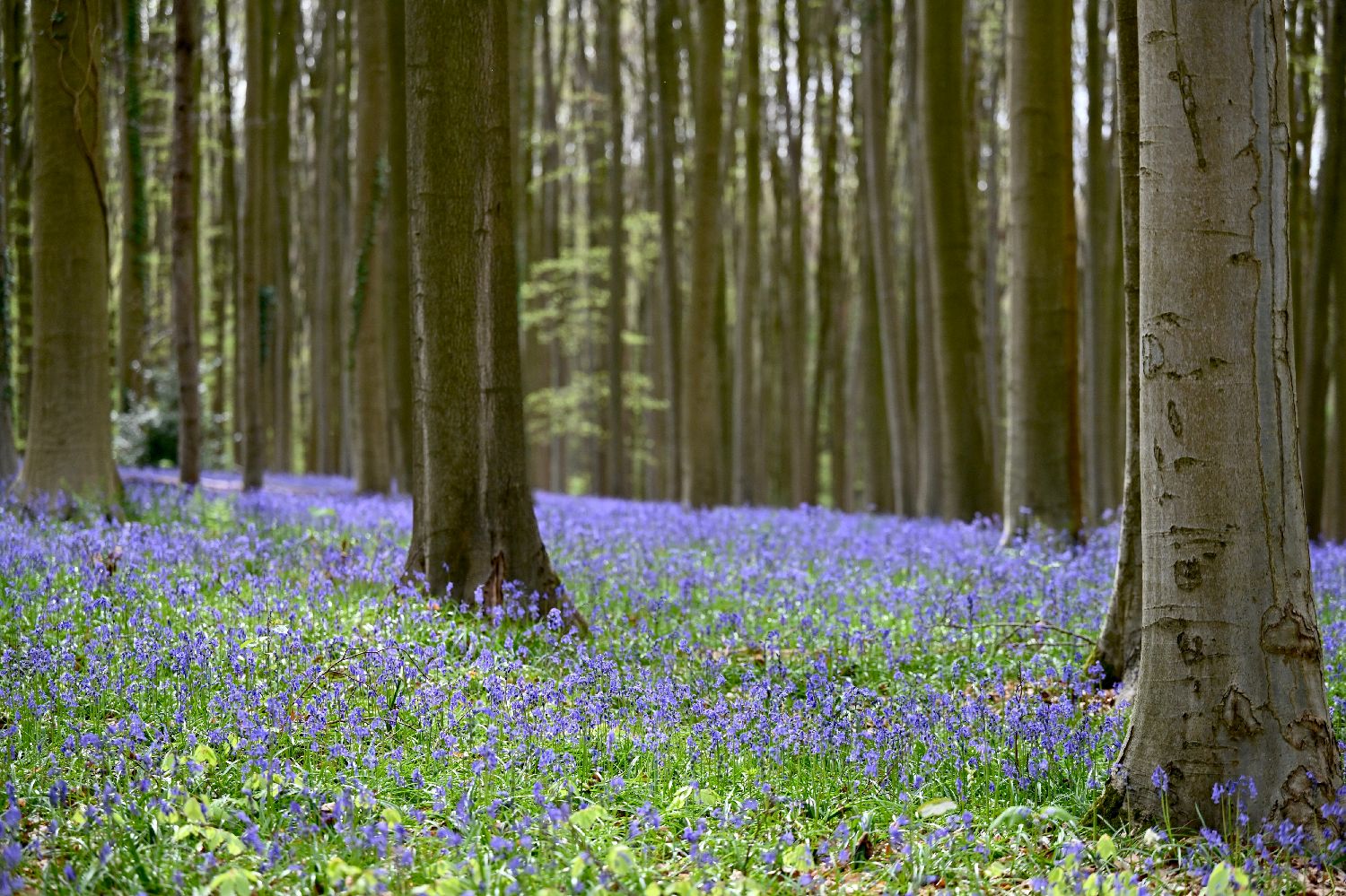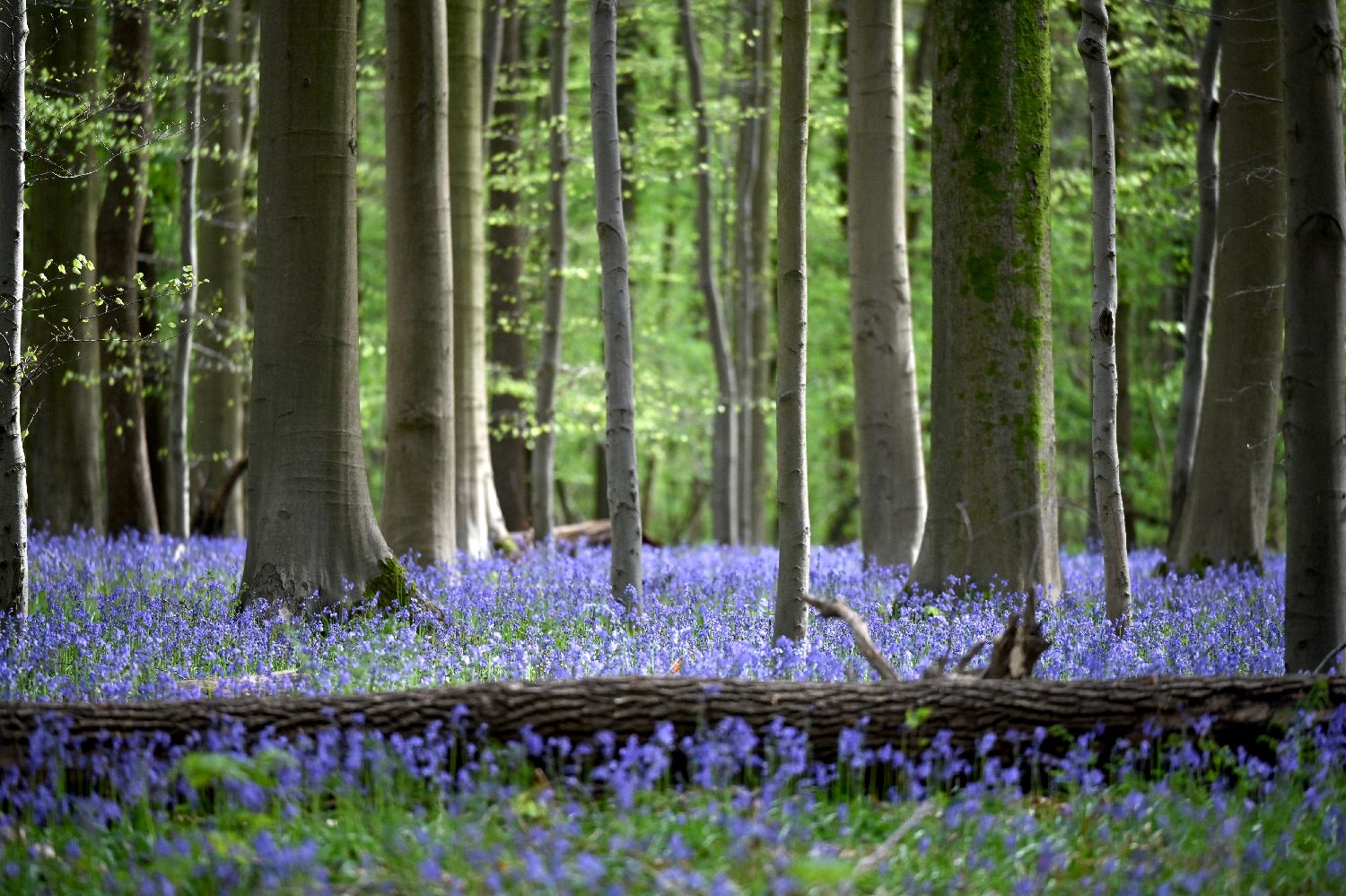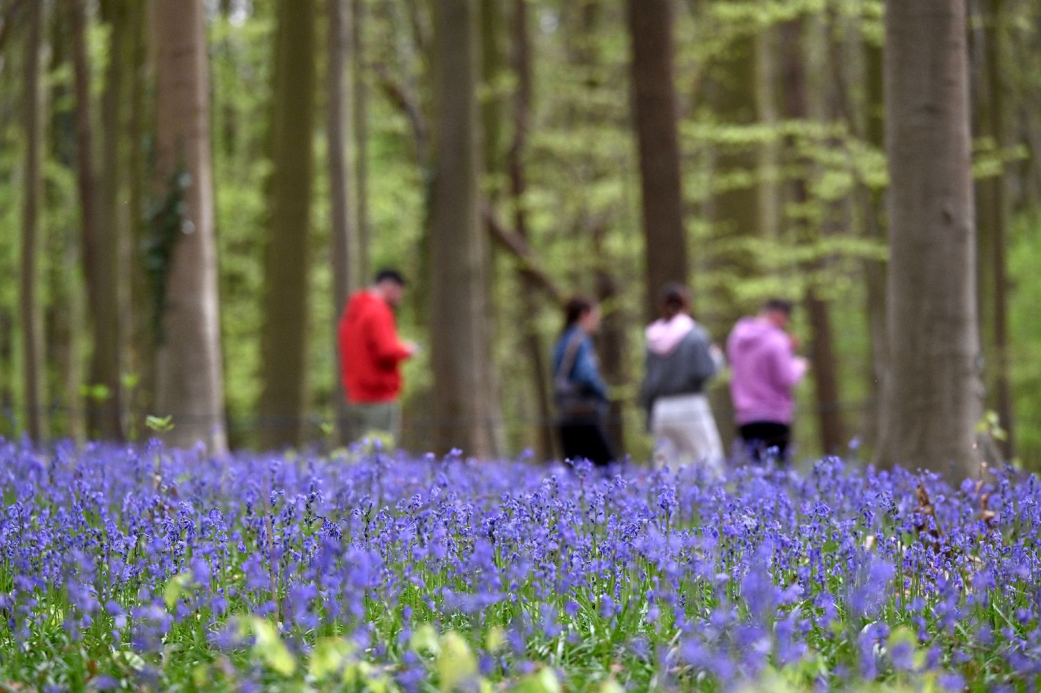 近日,位于比利时布鲁塞尔以南约20公里处的哈勒森林里大片蓝铃花盛放,游人漫步林间,尽享春日时光。