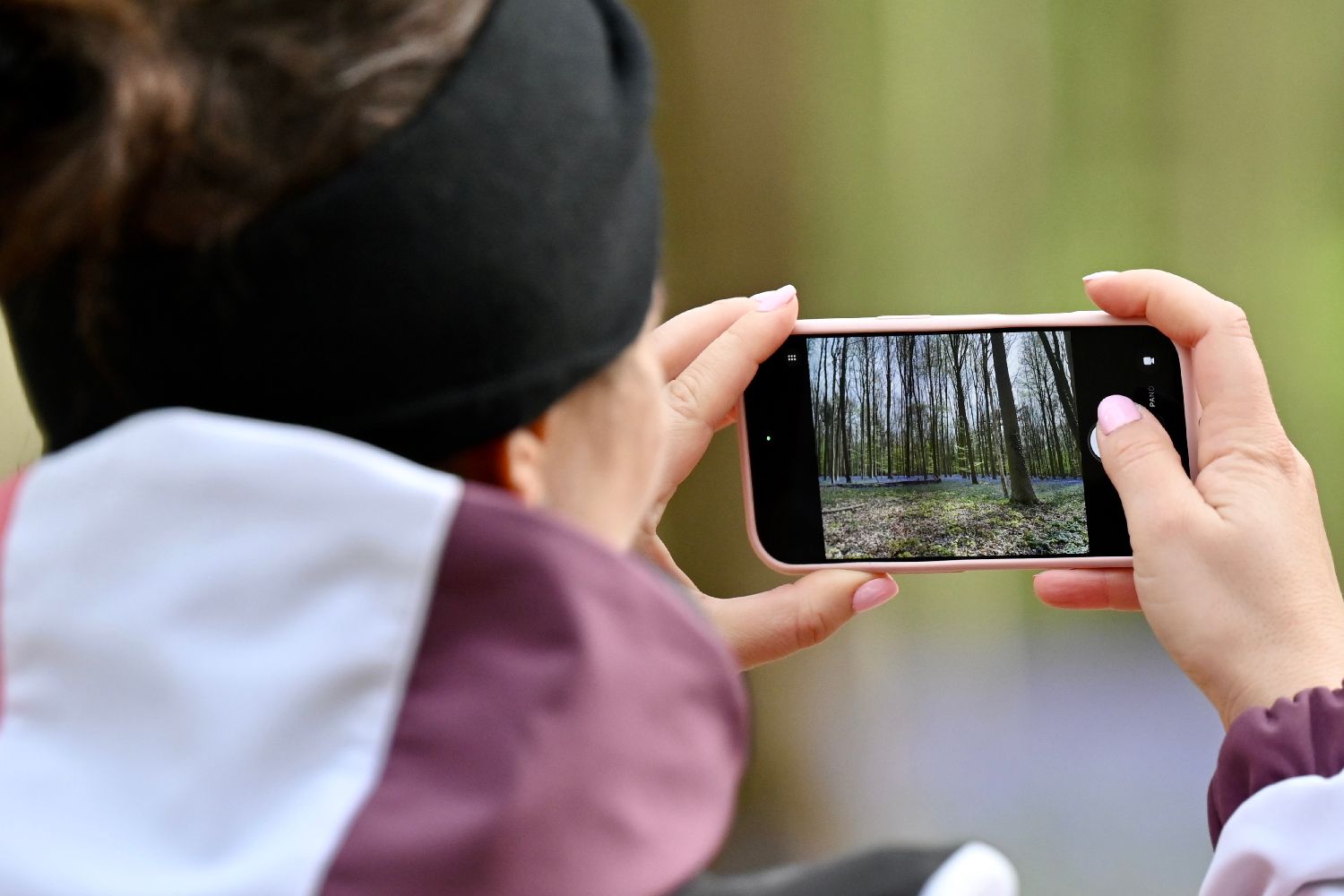 4月12日,一名女子在比利时首都布鲁塞尔附近的哈勒森林拍摄蓝铃花。