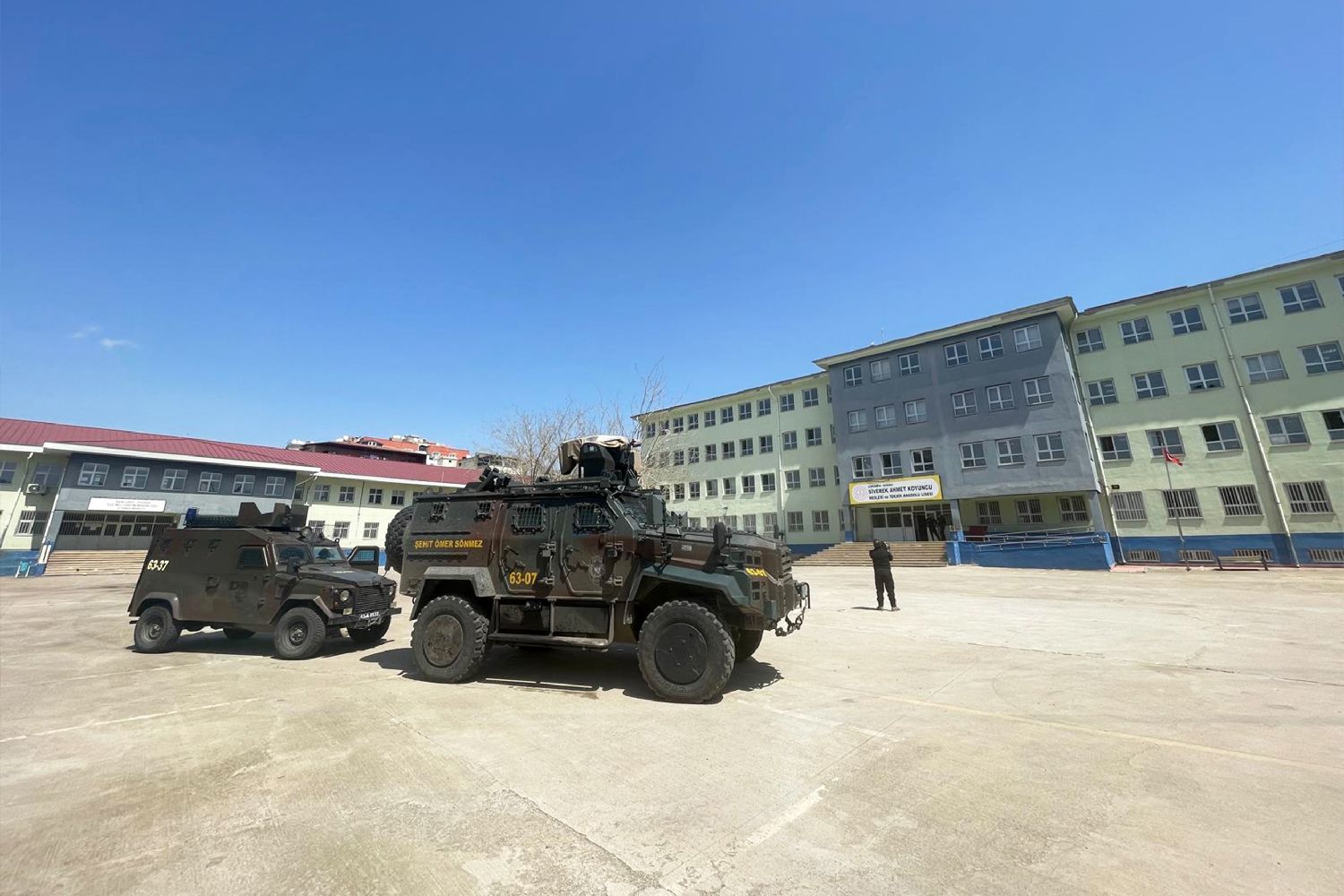 4月14日,在土耳其东南部尚勒乌尔法省的一所中学,警方调派装甲车辆加强保卫。